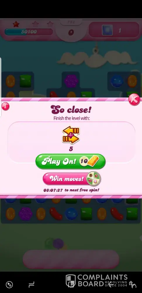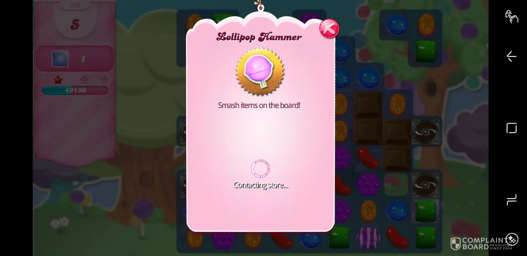 Then, as shown in screen pics I've taken, I needed to get rid of 1 more gel and went to use my coins to purchase a candy crusher. Well th the game was stuck to contact the store, and I eventually had to quit, losing the game. The timing of these things is inconstant.