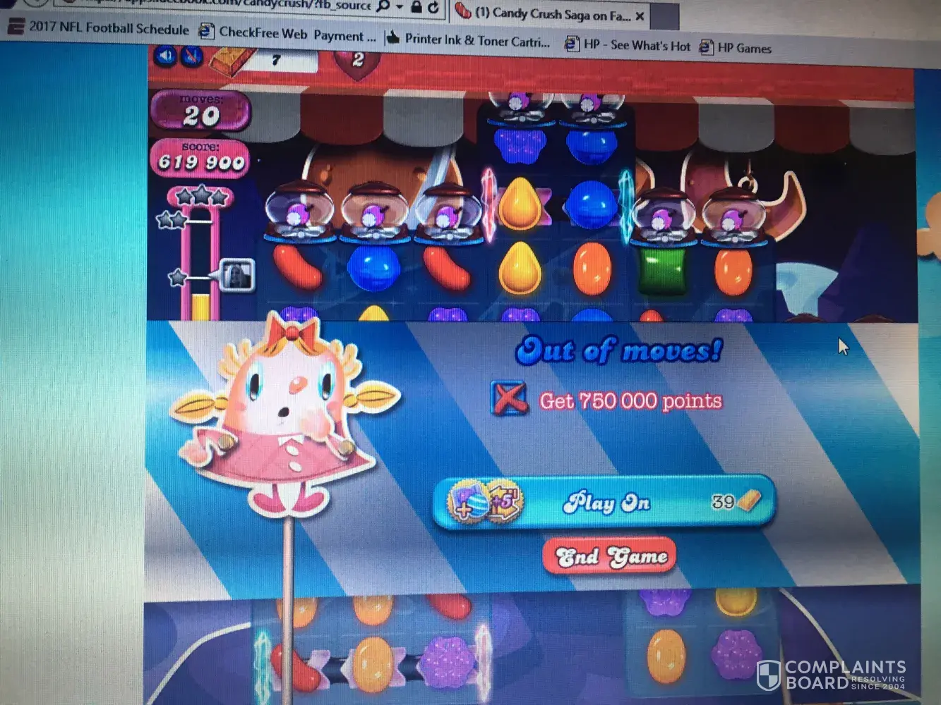 Playing level 1965 for days and days and days and never got over 20, 000 points - most of the time less than 10, 000 even though I was using boosters, etc. Today I got to 32, 000 and decided to buy extra moves. The first buy for 10 coins, showed the 5 moves available, but immediately the end of game message popped up saying I could buy more lives for 16 coins. Now shows that I have 10 moves, but I got the same end of game message. I have screen shots if you are interested. Very Annoying.