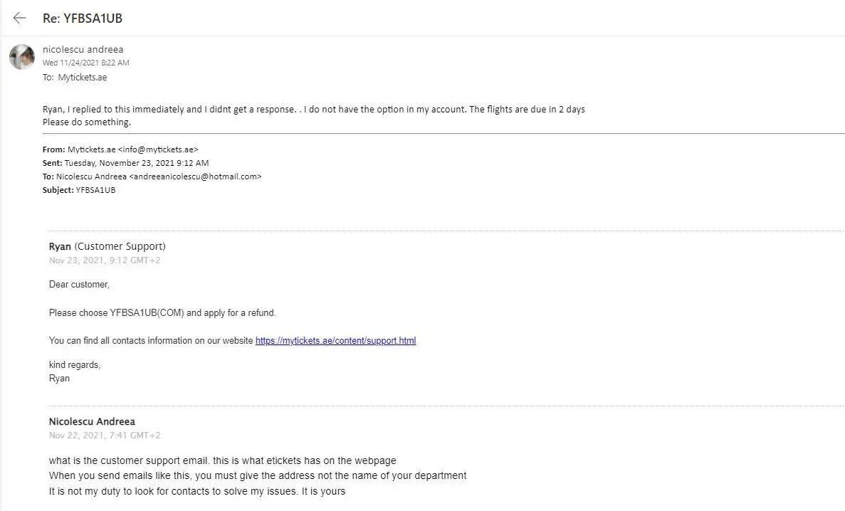 I still have a ticket of 2900 AED in my account which they wont allow me to process for refund. I have sent many emails requesting them to allow me to request the refund. I showed them the screenshots and the fact that I do not have the option. Now they went on silent. The flights are due on 26th and 27 November and I am asking them repeatedly to do something about it.
