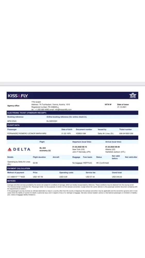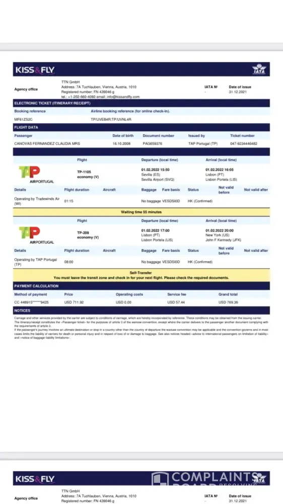 After almost 2 months of calling the agency and spending a lot of time on the phone we've got a notification that said that instead of being refunded for $1570.00 we have to accept a refund of $78.00, (right, seventy-eight USD instead of one-thousand-five-hundred-and-seventy USD) in 24 hours, otherwise even that amount will become unavailable. Even we disagreed with that, we clicked the acceptance button. Imagine what happened. Instead of being refunded/reimbursed, the Kiss&Fly charged our credit card for $78.00 on 02/11/2022