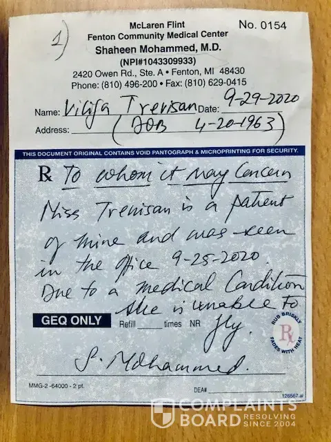 Unfortunately I was prevented to travel due to severe pains and fever. This was documented by my doctor. (See Attached RX document from doctor.