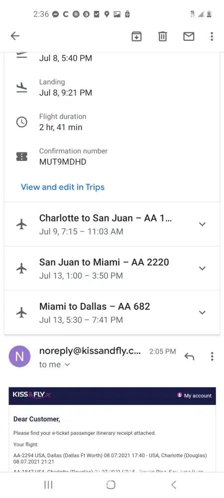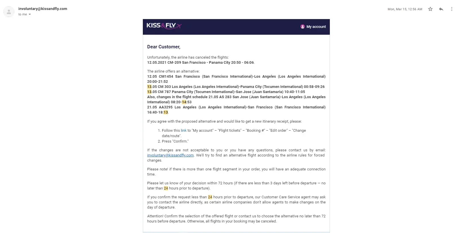 -Was alerted by KissandFly in February that the first leg of our trip was cancelled by the airlines, and they offered us alternative flights.