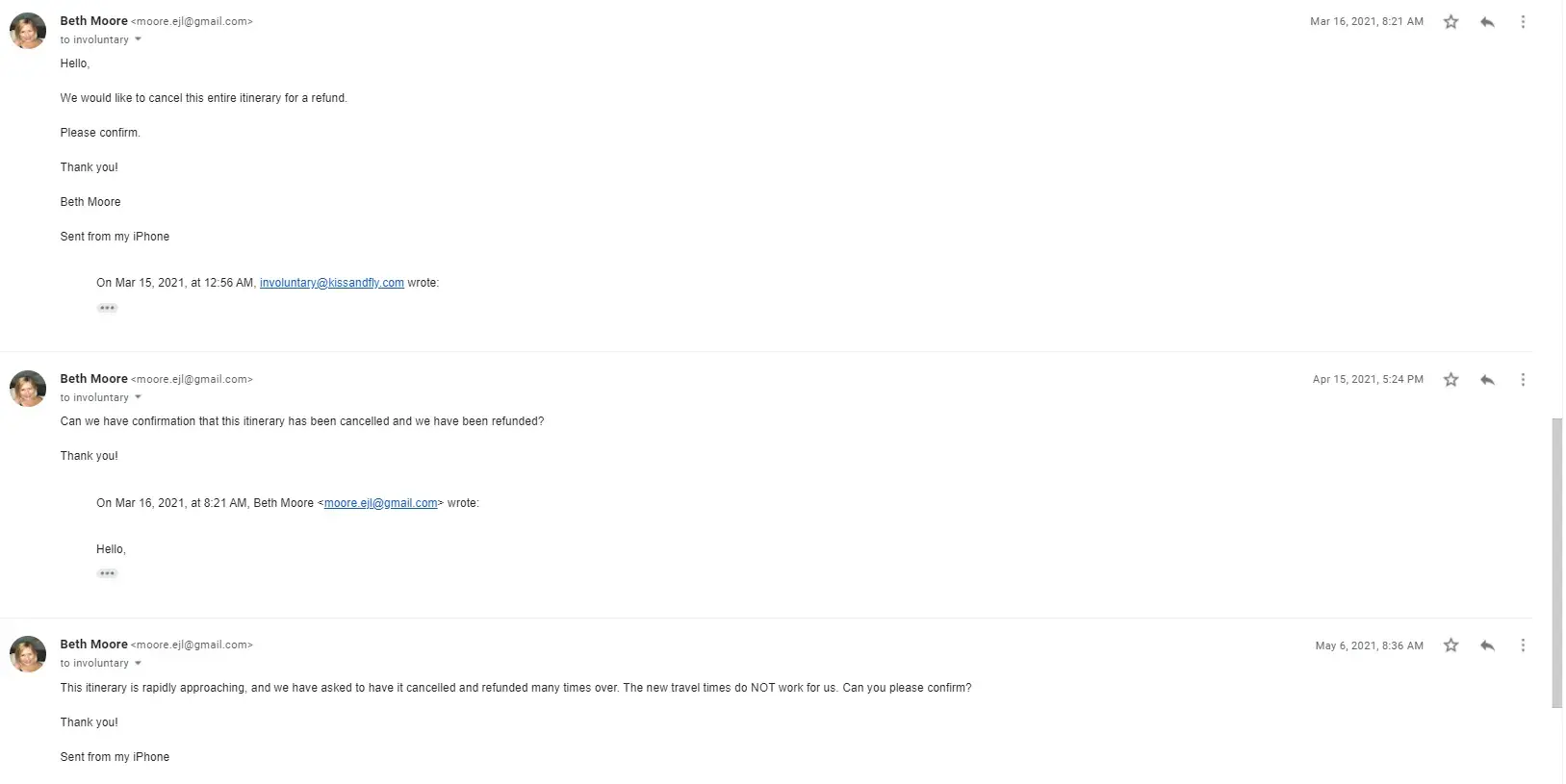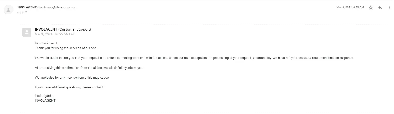 They will tell you that they are working with the airline to coordinate your refund, but in reality, nothing is happening. I'm even questioning if those tickets that were purchased and sent by email were real and not autogenerated by the bot or something. There is no way to validate it with the airline either. Once I contacted the airline they referred me to Kiss And Fly and they said that I should coordinate everything with them. The next logical step was to submit the dispute with the bank, but I can tell now, that Kiss and Fly know about these practices and they will trick everything. So despite the solid proofs you unlikely to get your money back this way. Be aware and don't fall into this trap.