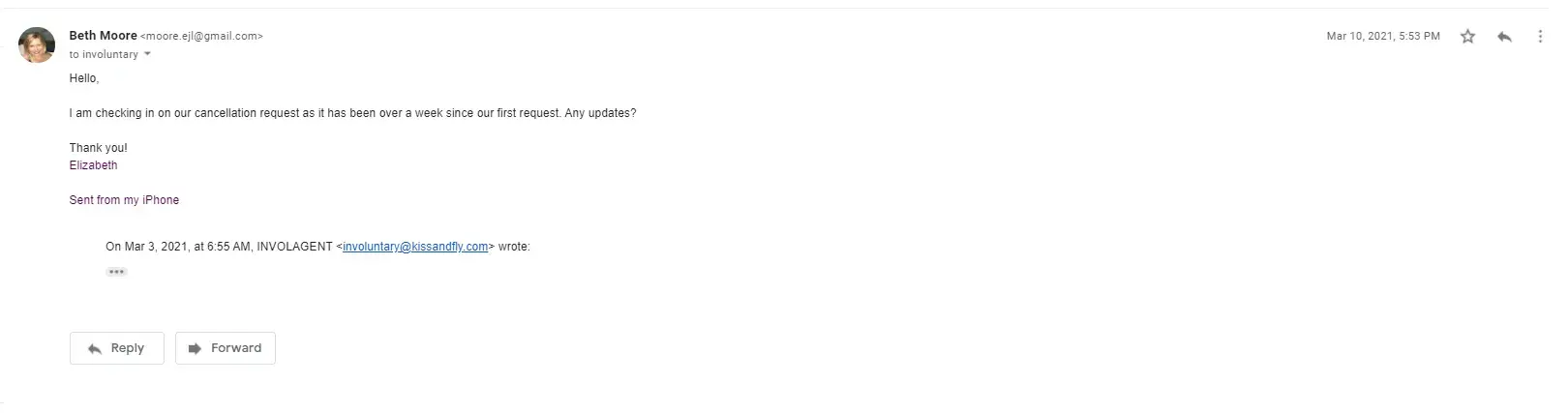 -We also received an email 5/18 from Involagent, cryptically stating "We confirm and cancel a request for changes." It was strange, but given the conversation with the male employee, and understanding that this is not a US based company, assumed something had been lost in translation, and that everything was under control.