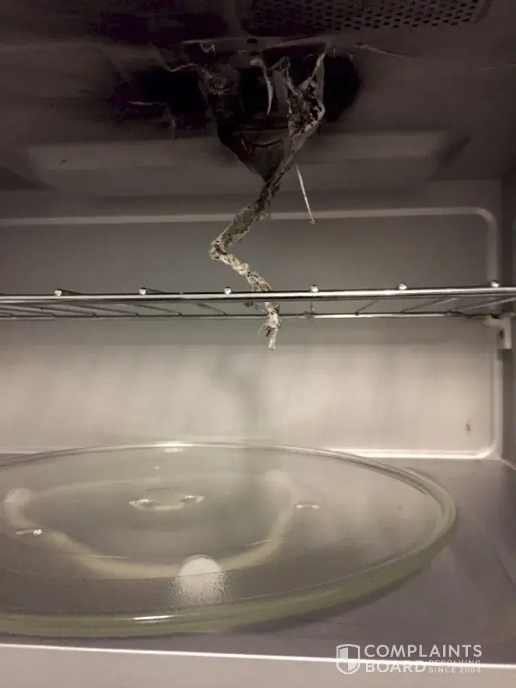 If you stand by your microwave product it should be repaced or costs replace photo of inside microwave ,top exploaded and fire