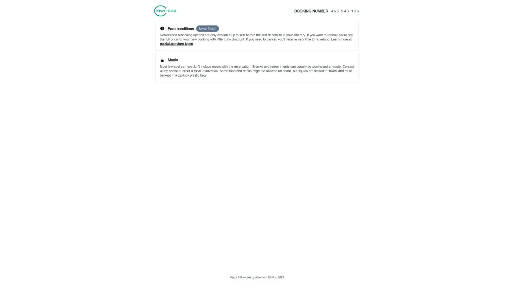 In April 2023 I booked two tickets for a flight from Palermo (Italy) to Munich (Germany) for late September 2023 thru Kiwi.com. The original booking included seat reservation charges which they were not able to provide and which I duely received a refund.