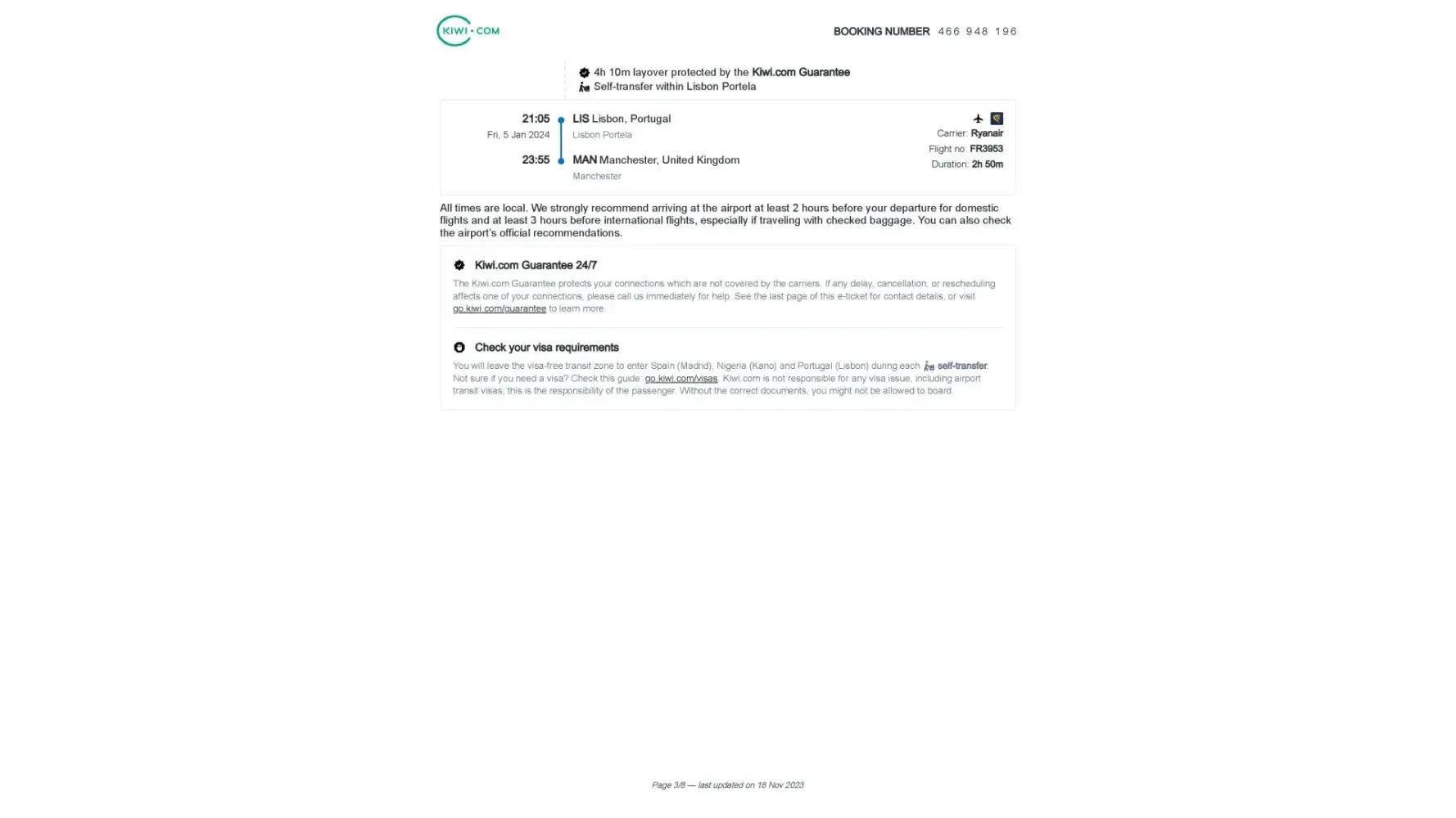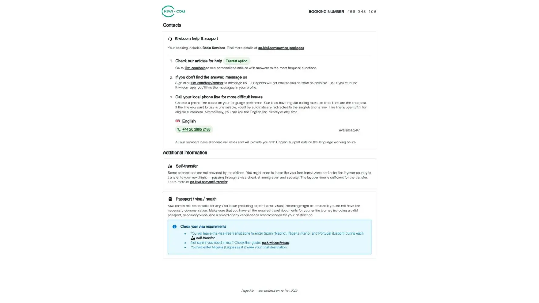 We were disappointed with Kiwi's service and we advise others not to use them unless they have the time, money, and energy to spare. We had no consumer error and made no mistake while booking. We arrived at the airport early and our flight was planned as scheduled. The only issue was that Kiwi failed to provide a working reference number for one of our two tickets. This mistake cost us an extra $584.94 in new flight tickets, approximately $206 for an international phone call to rectify the situation, and 3 hours delay. We have read many negative reviews about Kiwi and it's clear that this company does all that they can to shirk responsibility for their mistakes and maintain zero accountability.