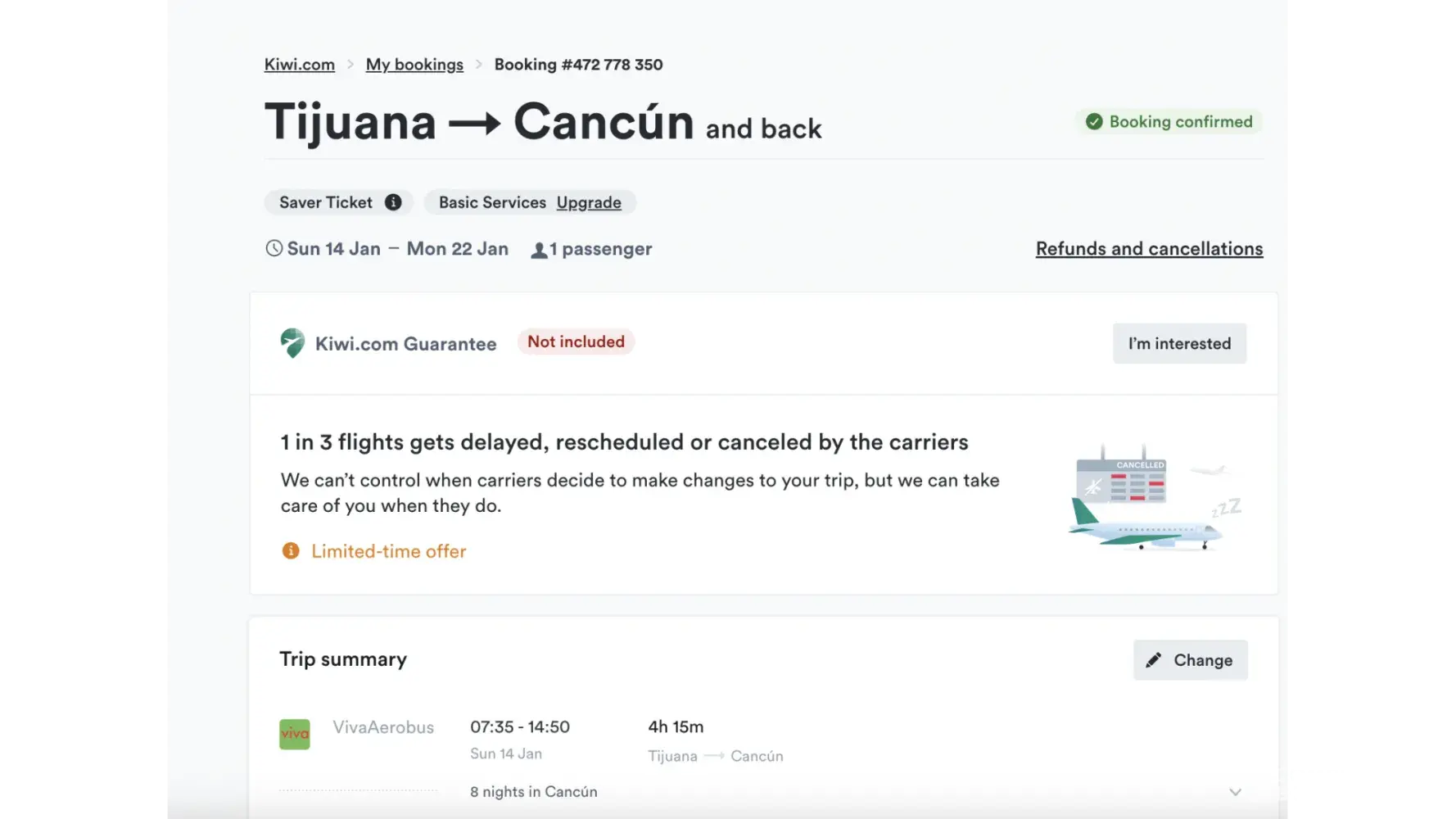 Step 2: kiwi.com first confirms the booking, and then cancels and offers other options (2 times more expensive) or a refund