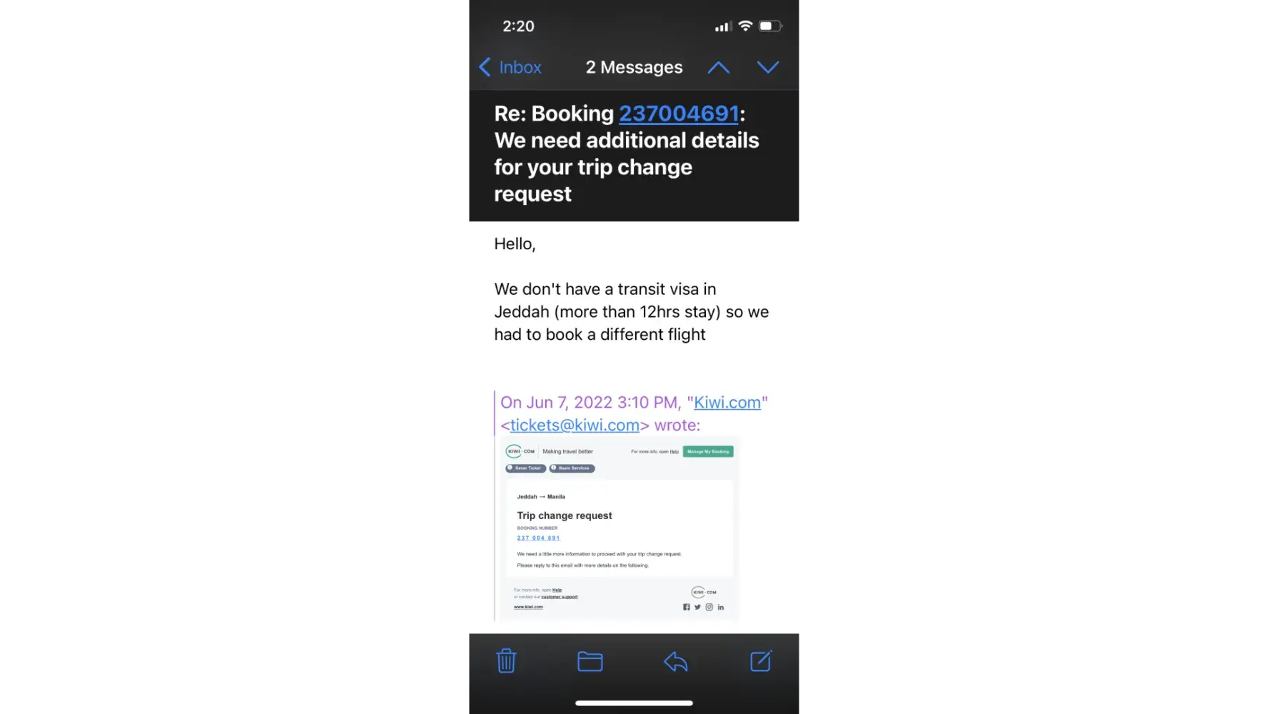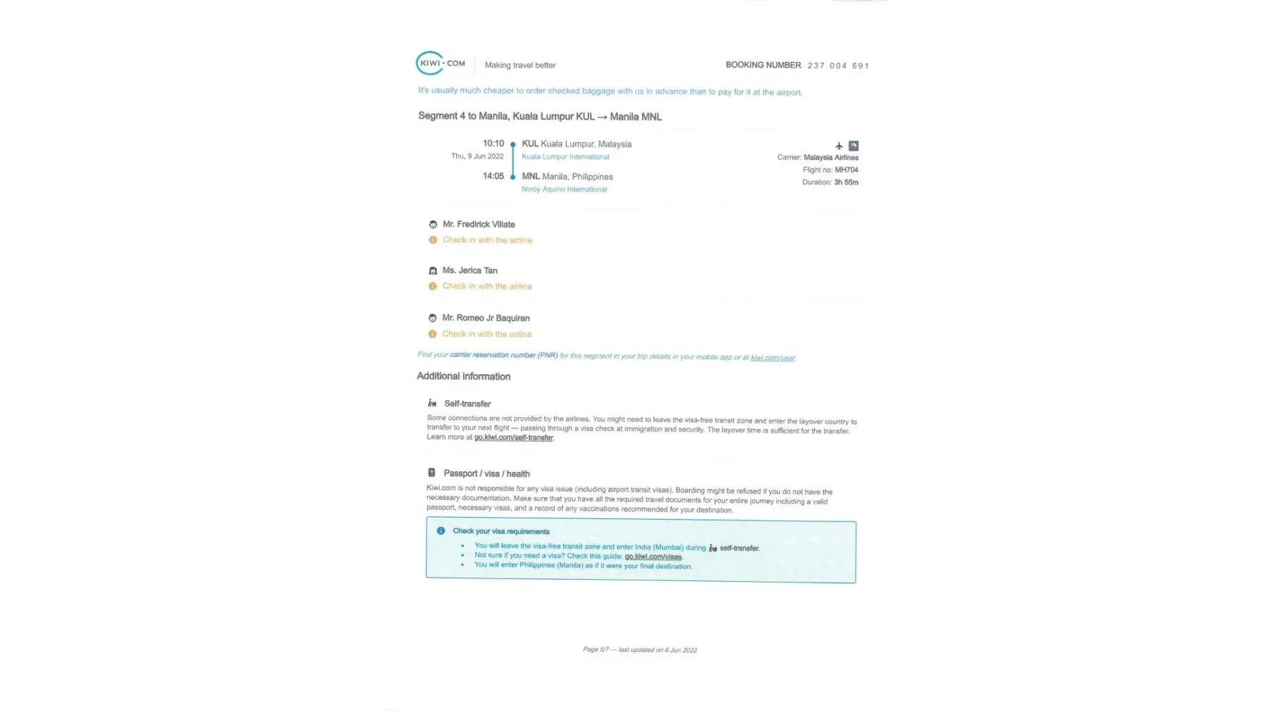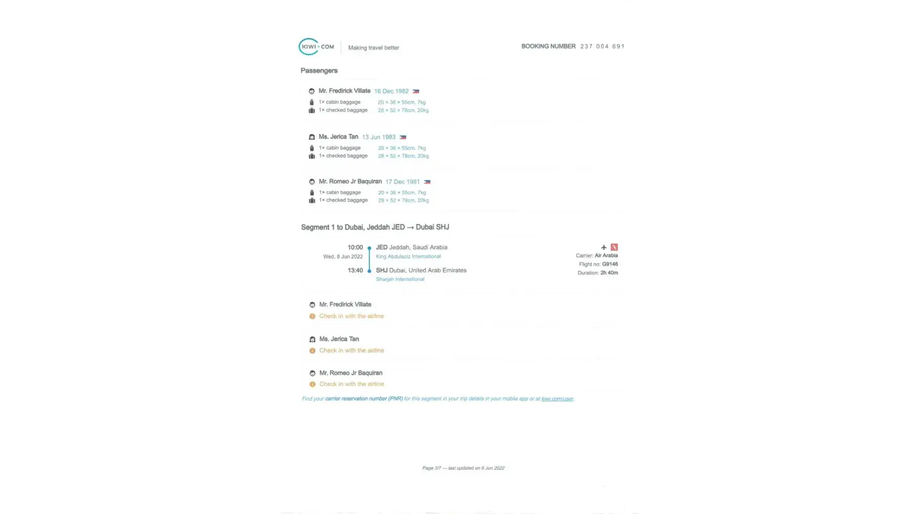 1. We purchased tickets via KIWI.COM but we were not informed that a transit visa is needed in Saudi for layover that is more than 12 hrs. As a result, we were unable to use the tickets. So what we did was, we immediately contacted Kiwi to request for a change of itinerary (Kiwi email file). Accdg to their rule, changing is allowed as long as reported within 24 hrs. After that, we did not hear anymore from Kiwi despite several follow-ups. We ended purchasing tickets from another airline. We were not able to use the flight tickets purchased from Kiwi.com. This is supported by the passenger manifest of Air Arabia & Malaysian Airlines.