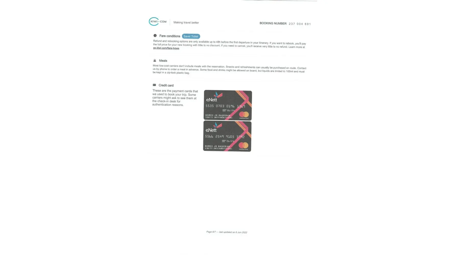 2. Card Fraud - please see attached E-ticket passenger file. On Page 6, we found out that Kiwi.com created a credit card under the name of one of my companions (Romeo Baquiran Jr). This is not the credit card that we used in availing our tickets. I used my credit card (Philippine National Bank) directly for the ticket purchase.
