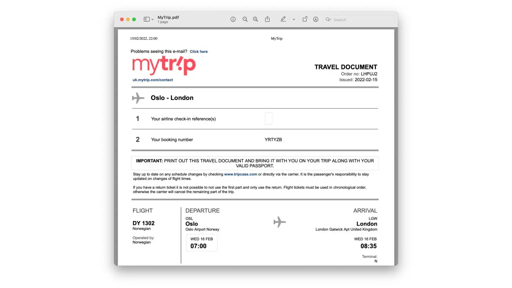 I supplied all information with receipts showing that the SAS flight we took on Feb 15th was delayed so we could not make our connection to get back to London. Tromso - Oslo SAS flight SK4425. It would have been very easy for Kiwi to check and see that delay. We tried to make the Ryan air connection but we were too late. I notified Kiwi immediately via the website and was told we have to apply for a refund of expesnes. We had to get back to London for work on the 16th and with our Ryainair flight being the last one of the day we had to book a new ticket on Norwiegen Air the morning of the 16th at 7am. It was on the Norwiegen air flight we also caught Covid and my husband was very ill with it.