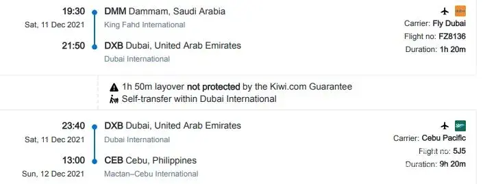 I booked a flight to the Phillippines on Dec 11, 2021, at 19:30 pm Dammam, will arrive in Dubai at 21:50 pm via Fly Dubai, FZ8136. Layover of 1h 50min. Leave Dubai at 23:40 pm via Cebu Pacific, 5J5, and will arrive in Cebu, the Philippines at 13:00 pm, Dec 12, 2021.