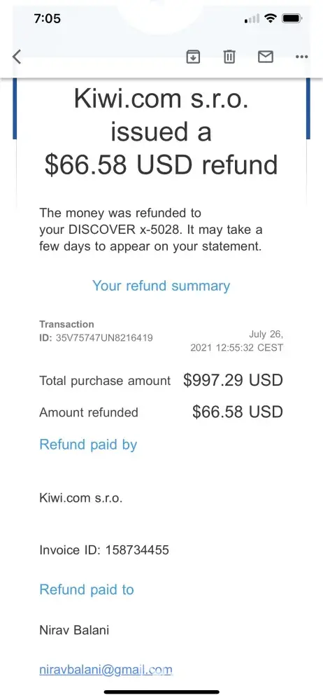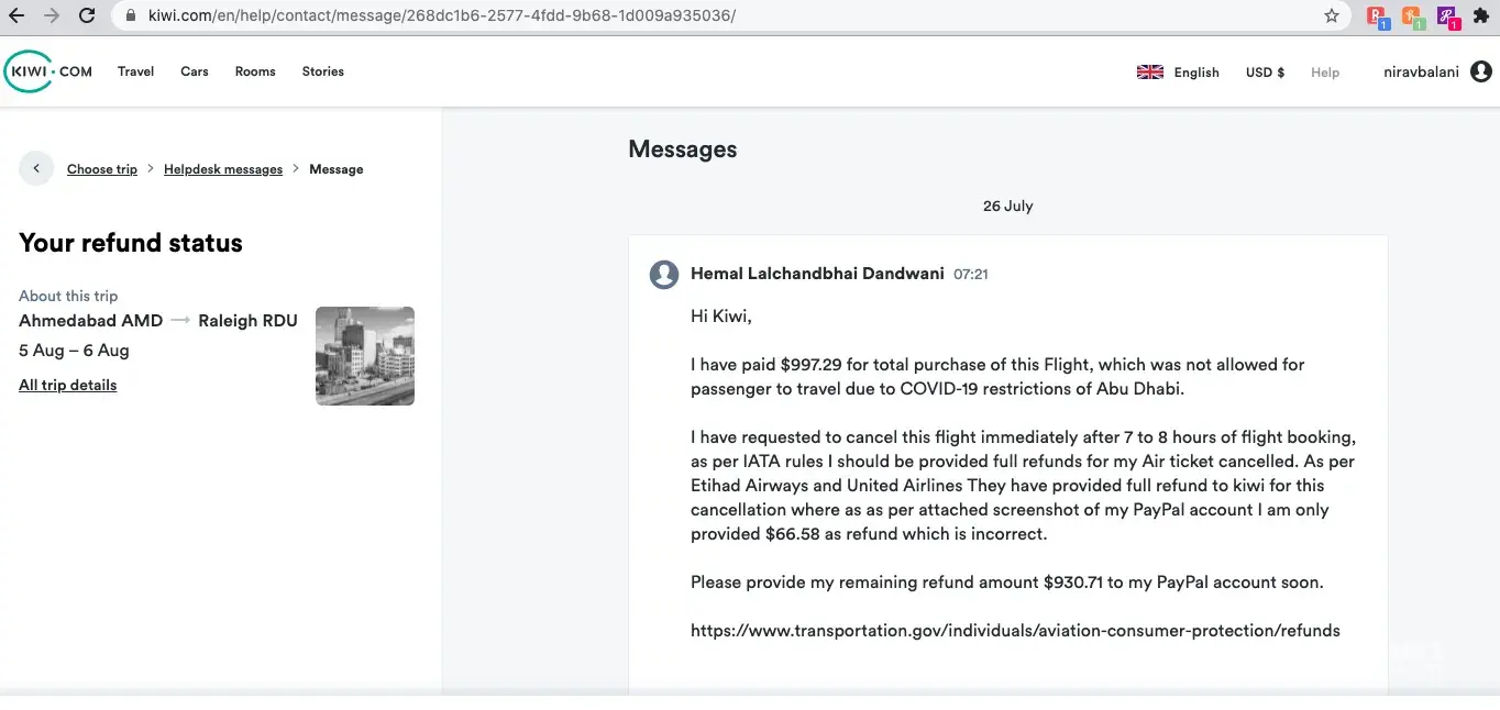 Resolution: Please help me to provide me remaining refund amount $930.71 to my PayPal account by kiwi.com
