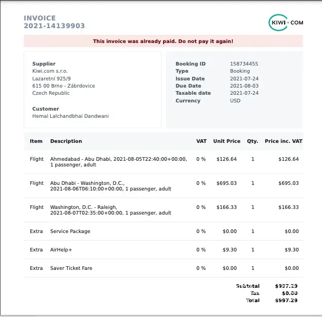 I booked flight thru kiwi.com for my niece Hemal Lalchandbhai Dandwani to travel to USA from India.