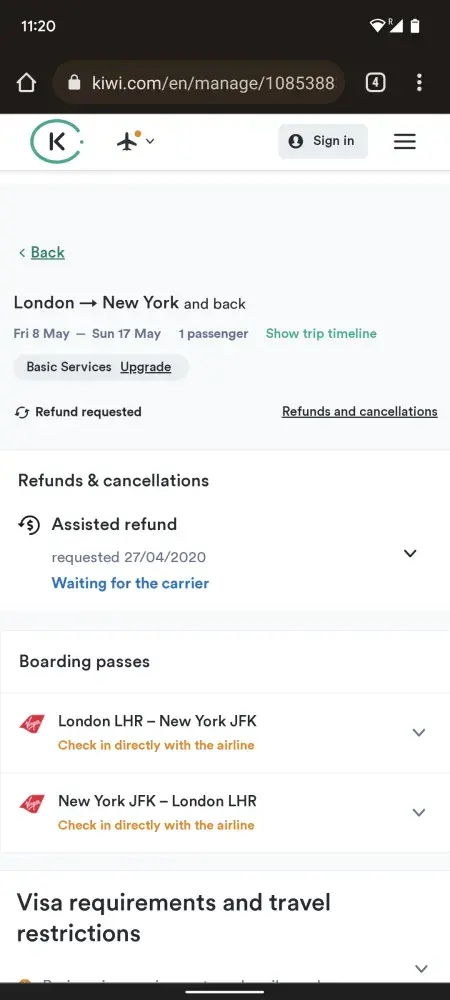 Booked a return flight London-NYC in March 2020 and applied for a refund in April 2020 because my flights were cancelled (covid). It has now been 20 months and I have not received a single dollar. I have tried contacting Kiwi.com countless times through every means possible, but they have either ignored me or been incredibly unhelpful. This practice seems highly illegal.