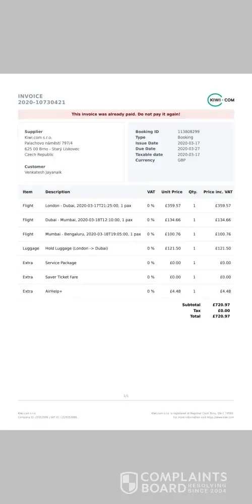 One of the passengers - Mr Nicholas Lucien Chandler - who purchased the flight tickets on the behalf of all passengers has been liaising with Kiwi however no or little information has been provided by Kiwi for many months. Some of the Kiwi.com staff who have looked into the matter, namely: include Rovina C (Kiwi travel consultant) and Suzanne S (Kiwi custom support) however as stated no information has been received from them for many months.