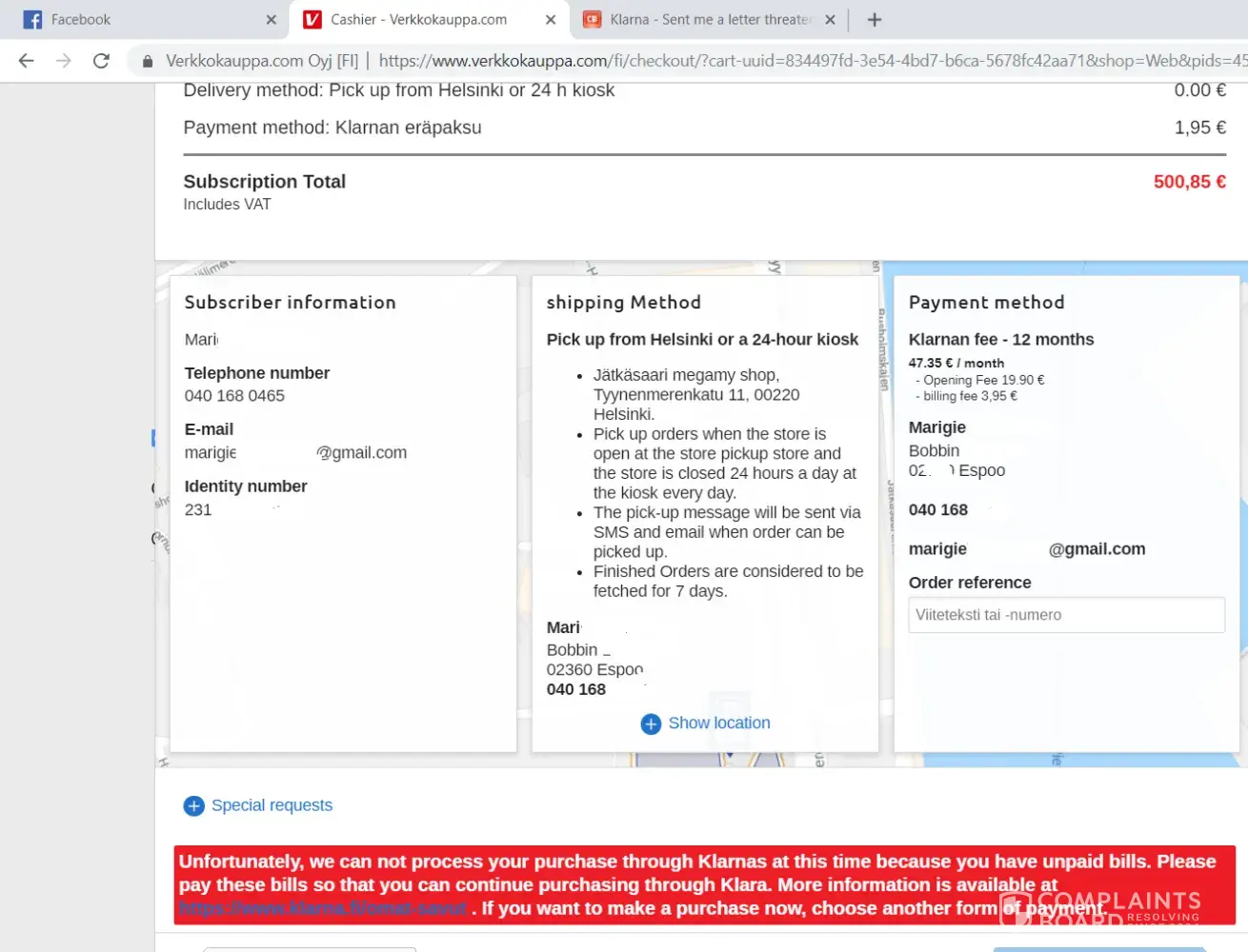 why do i have an unpaid bill since i didn't received the first product i ordered at verkkokauppa.com? i can't order another product. i cancelled already my first order to get new one.