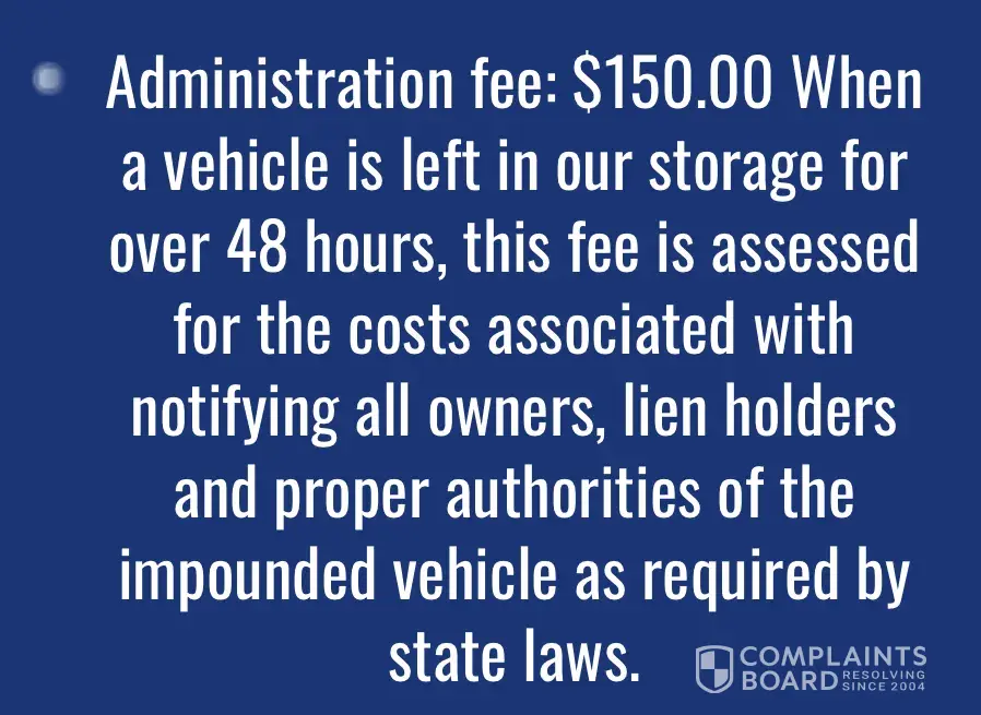 Klaus Towing advertises $150 admin fee specifically for the purpose of notifying owners, courts and others (as required by law) after vehicle has been left for 48-hours. I have been towed twice in the last six months by Klaus and the total charge for my vehicle left for 4-days was $530 and most recently $470 after 3-days and neither time was notified by mail, phone or otherwise but in actuality I reached out to them. I questioned the policy the most recent time and was told “...the fee is still applicable” which leads me to believe the lack or absence of filing not to mention the inflated price to do so.