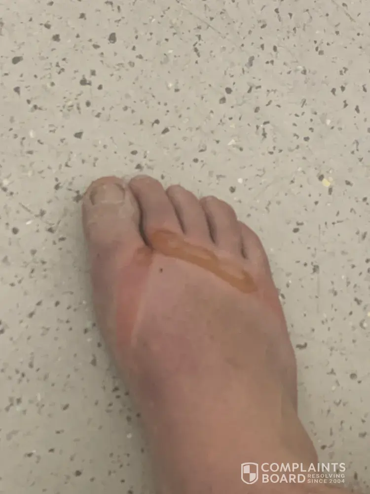 I got my partner a pear of $8 thongs on Wednesday and he wore them for 20 min and he got a burn from them and had to go to hospital now is un able to work hospital saod it was asid burn what r u going todo aboit this as it is the [censored]ing second pear he has got a burn frok u hyys