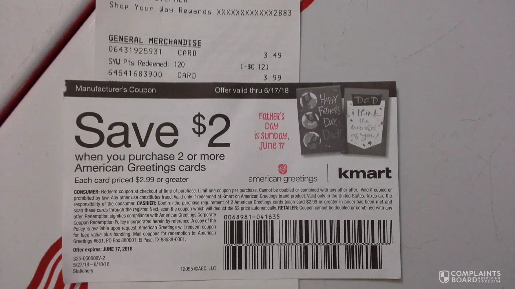Kmart had an american greetings $2 off 2 cards coupon located at their greeting card dept. When I tried to use the coupon, the store's register would not accept the coupon. I would be happy to scan my receipt and coupon. It hadn't expired, I made the eligible purchase. Neither the cashier nor manager could get it to work. They didn't make any attempt to fix it, I got an 'oh, well'.