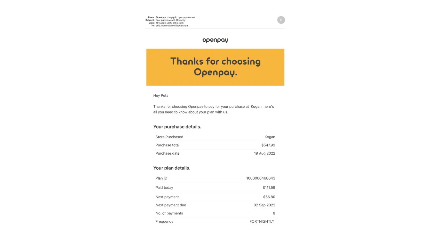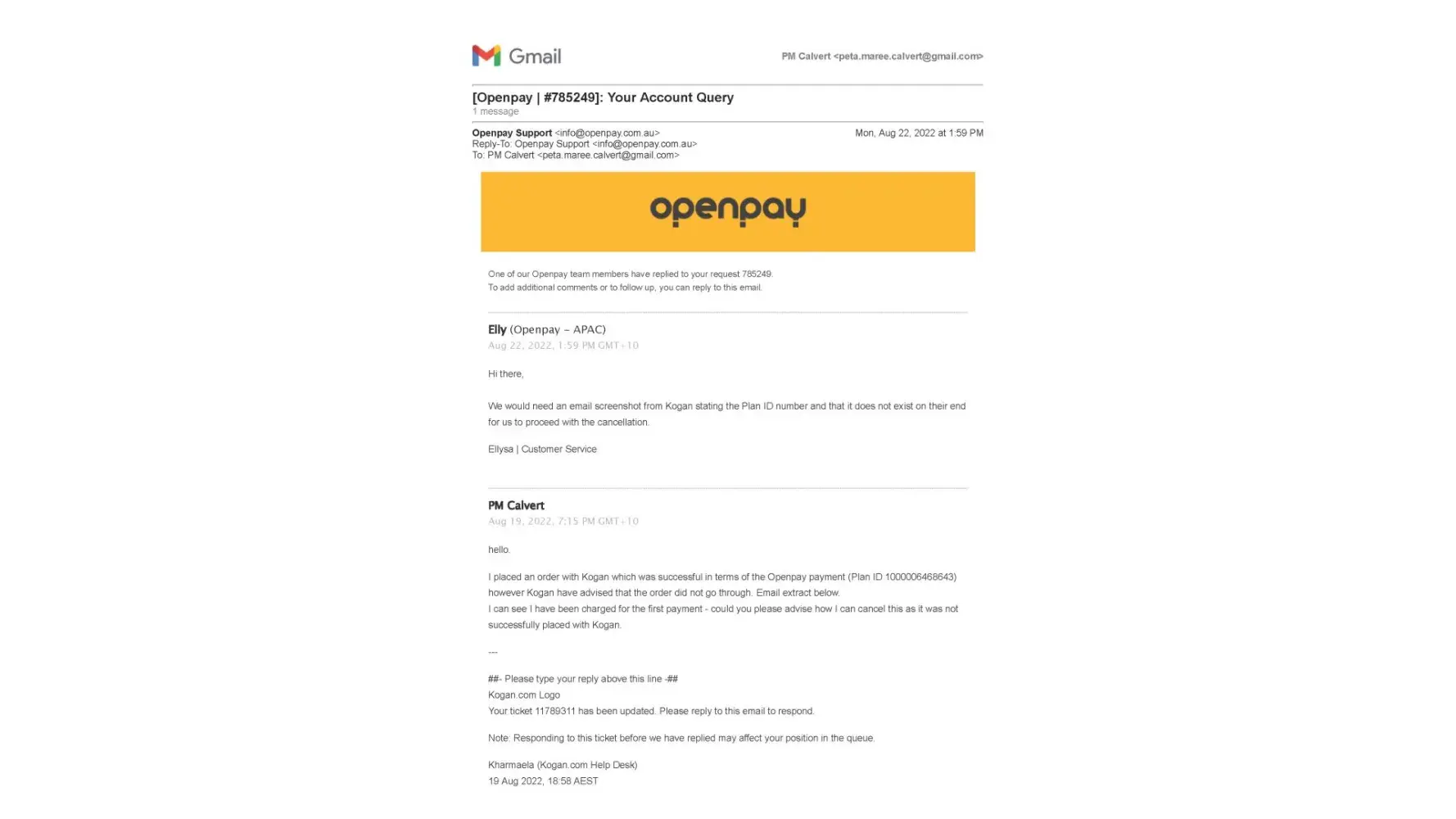I called Openpay and was told it had been charged, and they provided an invoice number for Kogan to check in their system. They also advised that Kogan would need to cancel the order as they could not be sure that I hadn't received the goods.