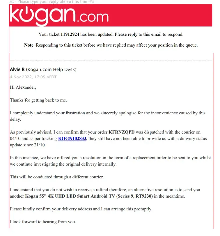 Purchased a 50" 4k TV on 1st August 2022 and straightaway had issues with the TV not displaying 4k. Made a written complaint to Kogan and was given a complaint number. But no one ever called or emailed. I played around and found the source of the issue and solved it myself. They sell 4k TVs without turning on the 4k option in the setting. Now I have issues where my TV goes blank for a second for God knows whatever reason. I'm so disillusioned with the Customer Service that I don't even know whether to call them. They couldn't care less after they've taken your money. Disappointing.