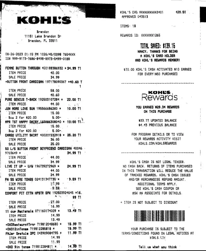 On Saturday 9/26/23 I visited Kohls in Brandon, FL., store was very busy, and sales associate was shuffling customers to the new self-checkout. There was no direction or assistance, I used my Kohls pay app. Total cost was $420.51. On Sunday 9/27/23 I visited Kohls in Orlando, FL, store was not busy, and sales associate was very helpful. She told me that...