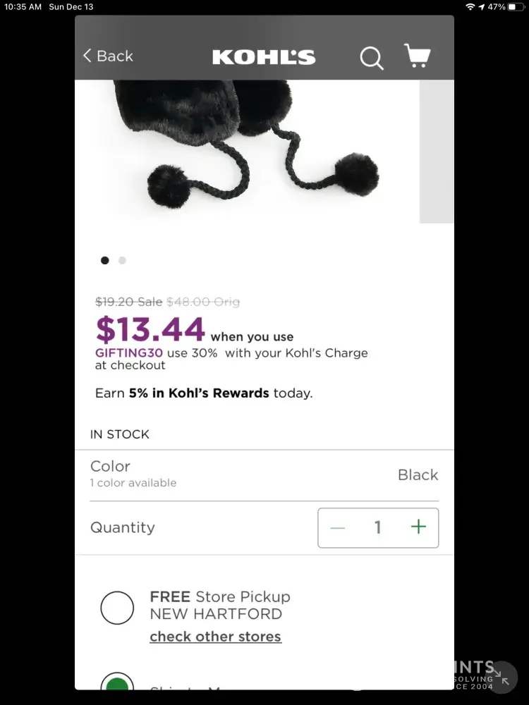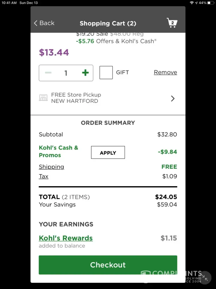 I contacted Kohl's chat, waited 28 minutes, and quickly learned that contacting the chat was a waste of time. I wasn't getting anywhere with him so asked to talk to he manager and he transferred me to her. Sadly, her words mirrored the associates. The tone of the chat left me feeling that I was trying to steal something. Let me explain. Order #[protected] the first item was SKU [protected] with the 30% off = $9.52 and the second item was SKU [protected] with the 30% off = $13.44.Added together with the $1.09 tax included = $24.05. No shipping charges - just pick up.
