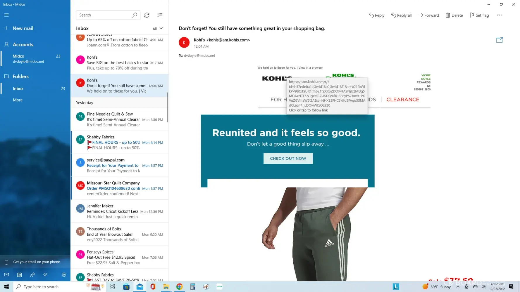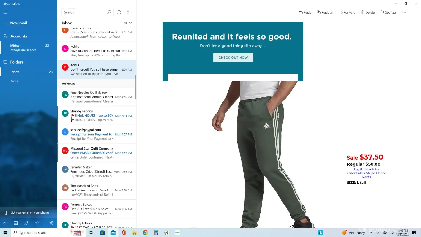 On 12-26-2022, had n my cart an order for 1 par of Big & Tall adidas Essentials 3-Stripe Fleece Pants, size L/tall pants.