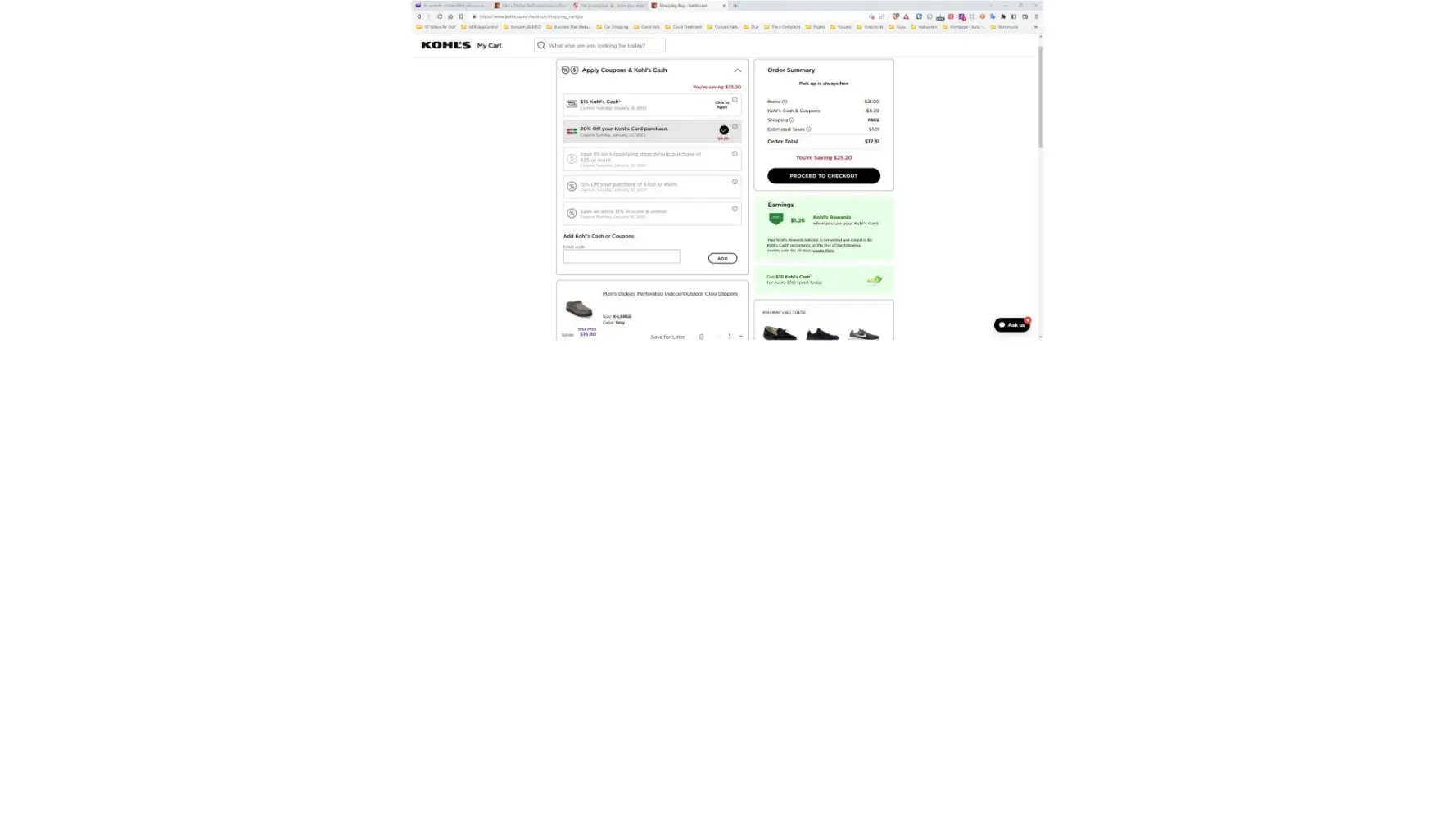 When using the 20% off coupon, the cost came to $16.80 ($4.20 savings). Then I go to use my "bonus" of $15.00 Kohl's cash and the price should have come to $1.80 (+ taxes). However, the price shown was $4.80 (+ taxes).