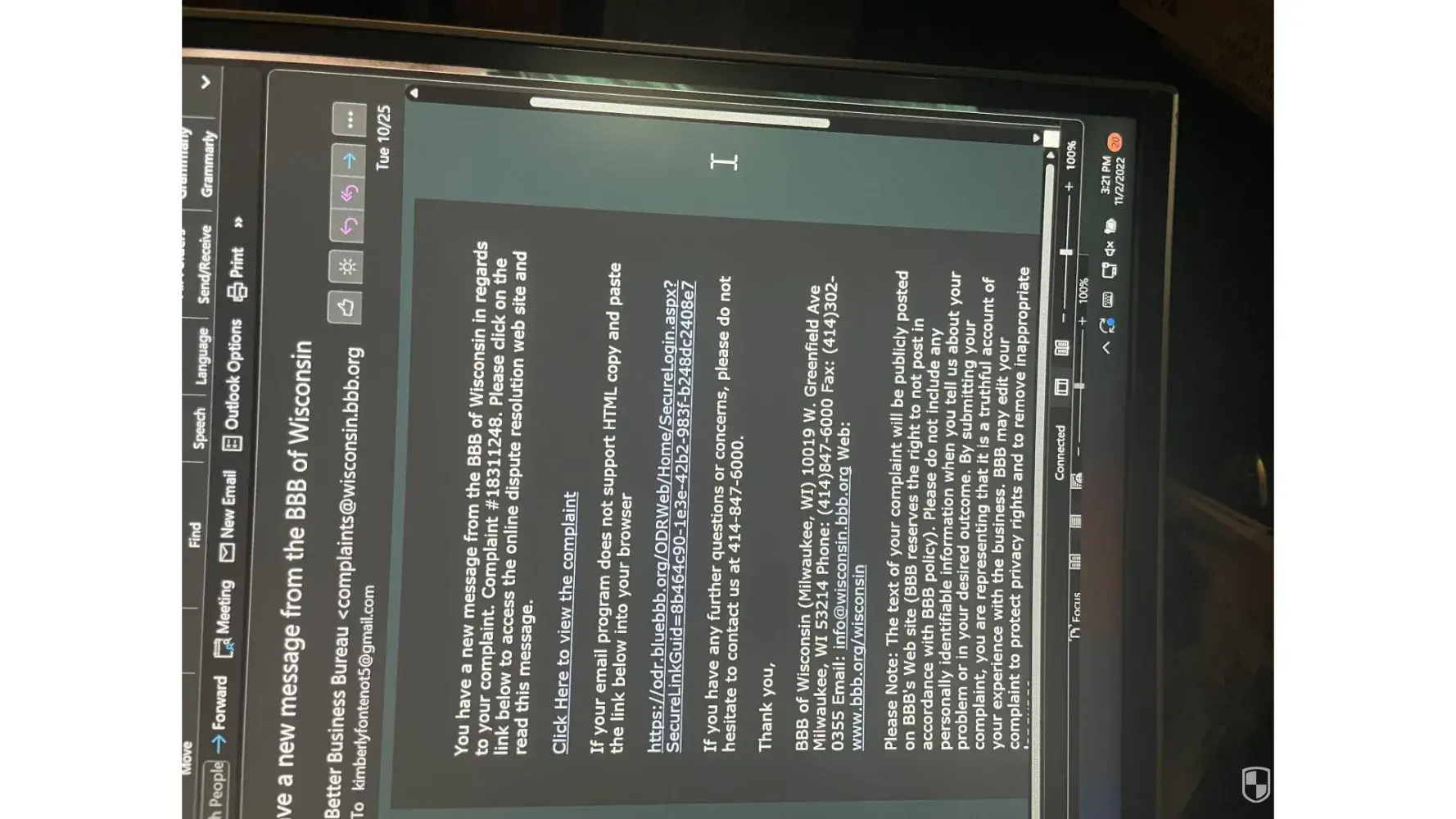 Thank you for filing a complaint with the Better Business Bureau.
