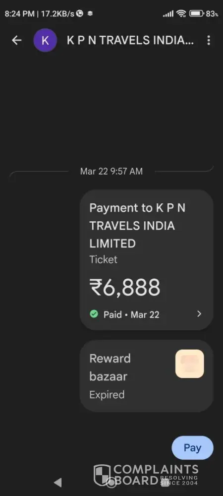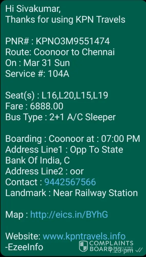 I have booked tickets in Railyatri(KPN TRAVELS) fradu travels. We have reached the boarding point on time(9'0clk). But bus has not arrived yet. We have waited till 11 o clk. But there's no response from the bus side. Not even received any contact number. I want refund for the same.