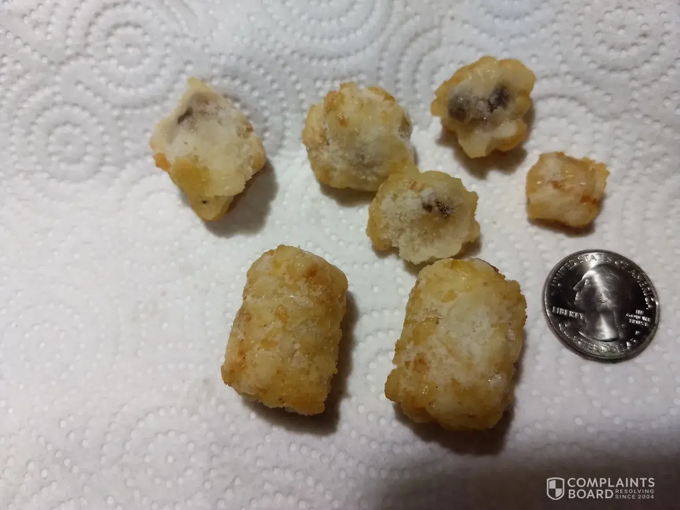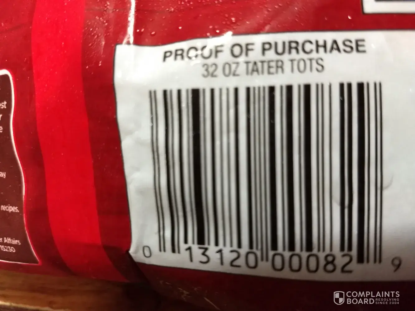 I purchased these at Walmart neighborhood store two days ago. The tots we're all black inside of them and we're falling apart. Also they had a bad odor. I was very dissatisfied with them! I am adding photos to show of how bad they looked right out of the bag. And photos of the UPC code as I didn't keep my receipt. My family loves these so much and this is not the first time I have had this problem.