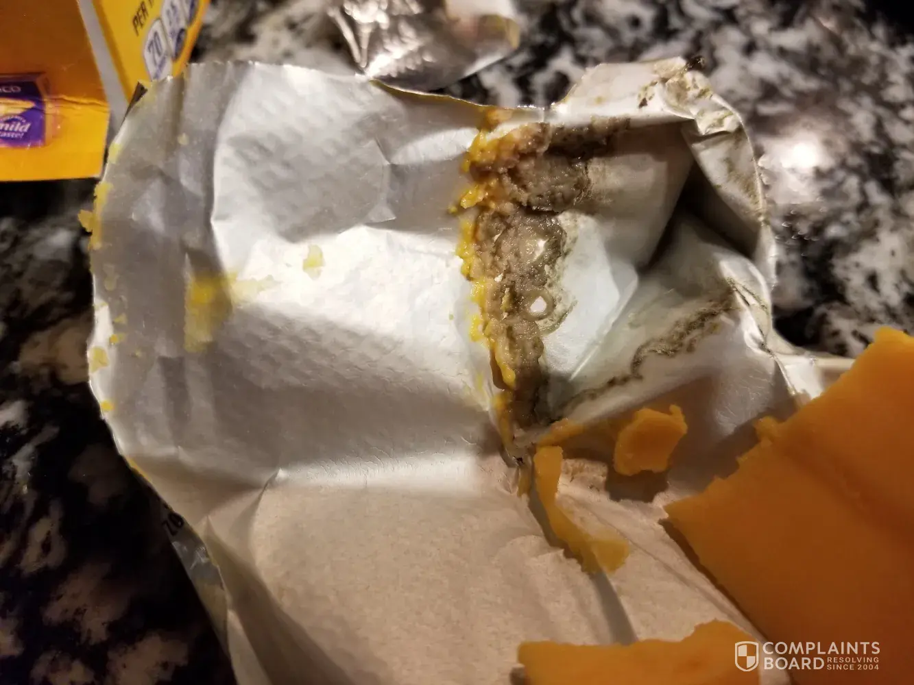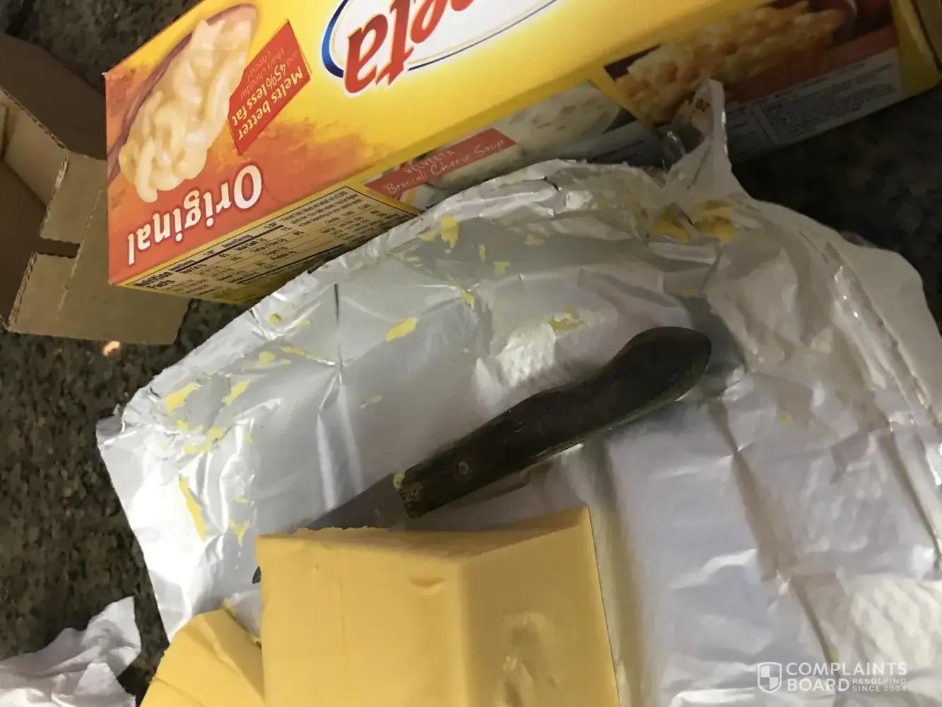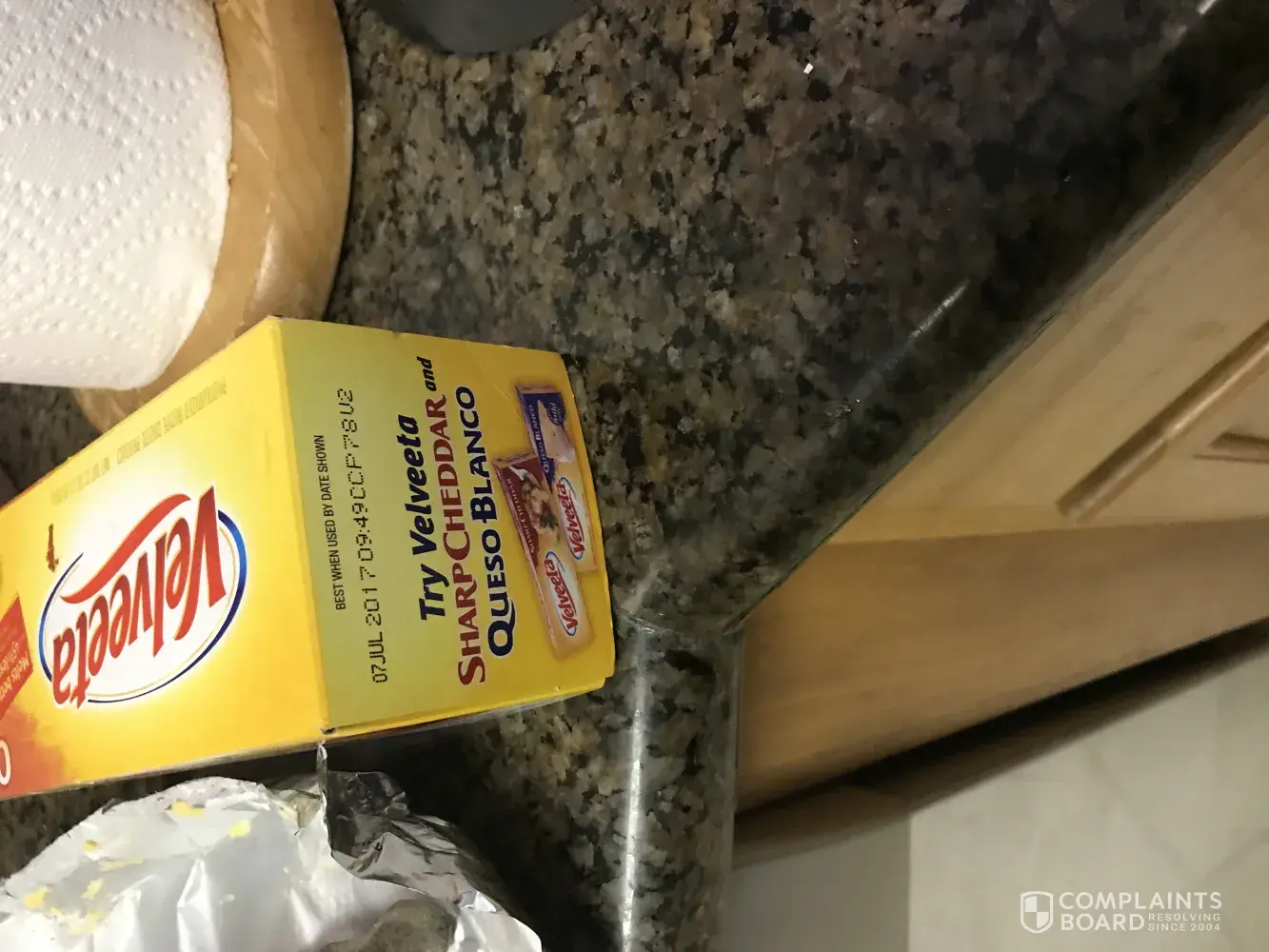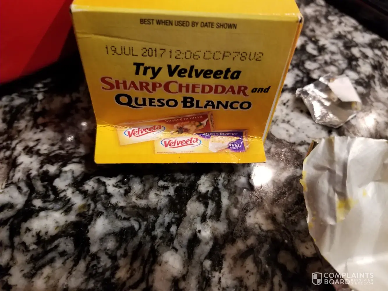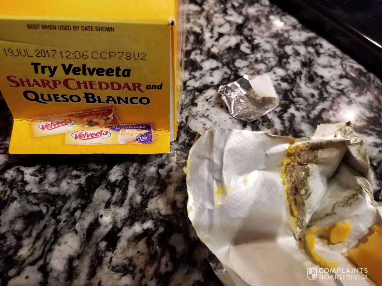 I opened a new box of Velveeta yesterday 06/13/2017 & found a disgusting substance in the corners of the package. I have no idea what it could be, but I will most likely never buy Velveeta again. Pictures are attached along with the lot# of the package. You may want to check into it. We are hoping to not become ill. Feedback appreciated. I do not have a purchase receipt as we do not keep grocery receipts.