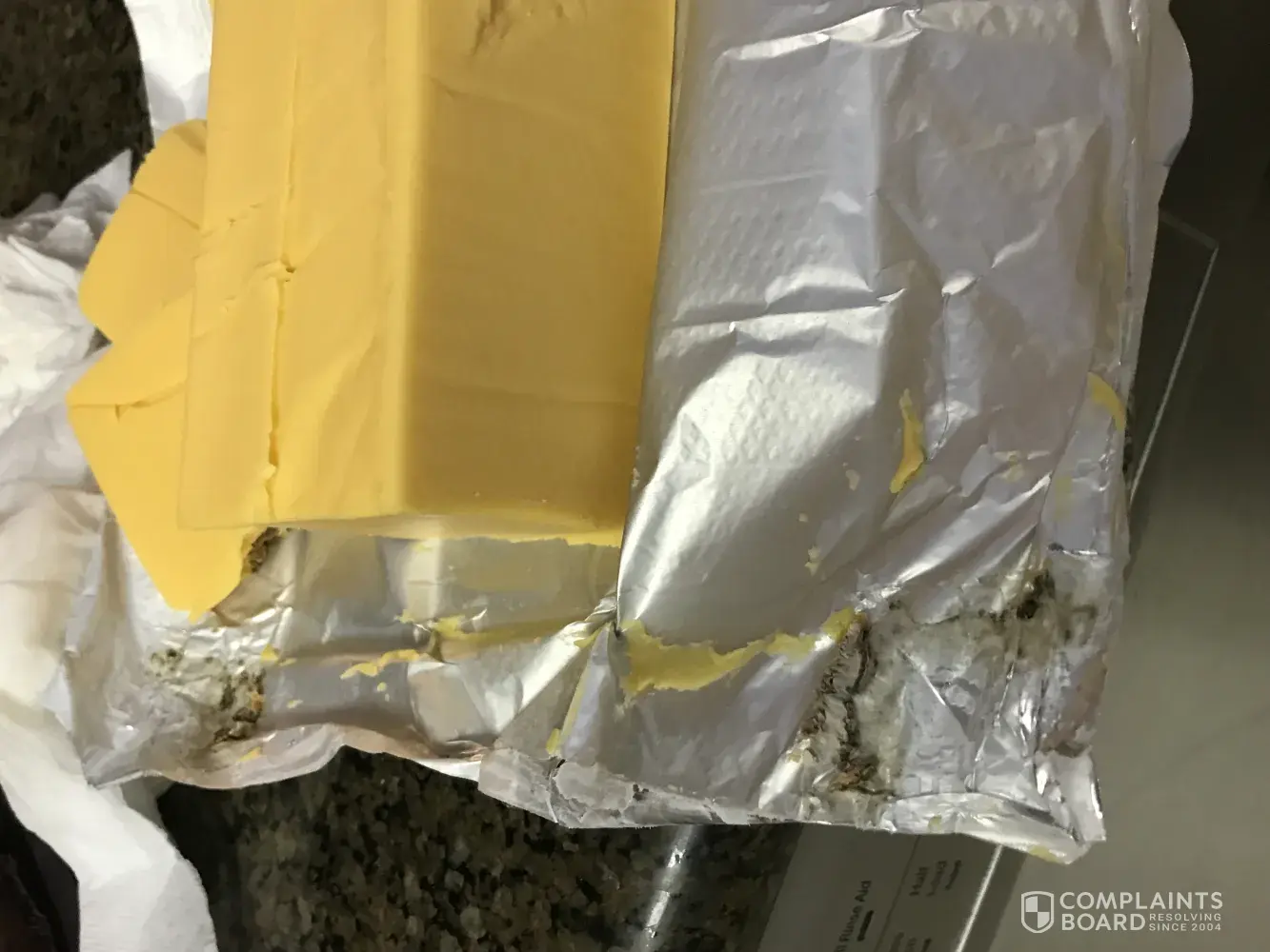 Opened package and in corners it has this black material in the corner and it's very gross. I have pictures and production date in attached. I always buy this cheese it's one of my favorites but I won't buy again. Please look into this someone could get very sick. Black spots were in one corner and on that end of the cheese. Looks almost like mold.