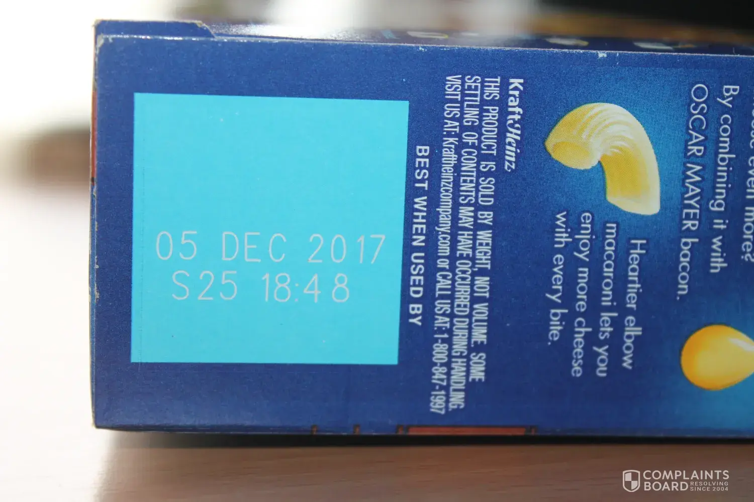 I recently bought two packages of this macaroni and cheese from a Walmart here in Rochester Hills Michigan- The container of bacon bits in each one was moldy- Package had sell by date of 05 dec 2017 (s25 1848) The first package I threw out thinking it was just a fluke but when I got the 2nd package and it was moldy as well I knew there was an issue. My wife and I have always bought Kraft and have never had an issue. I'd like to be reimbursed for these 2 boxes.
