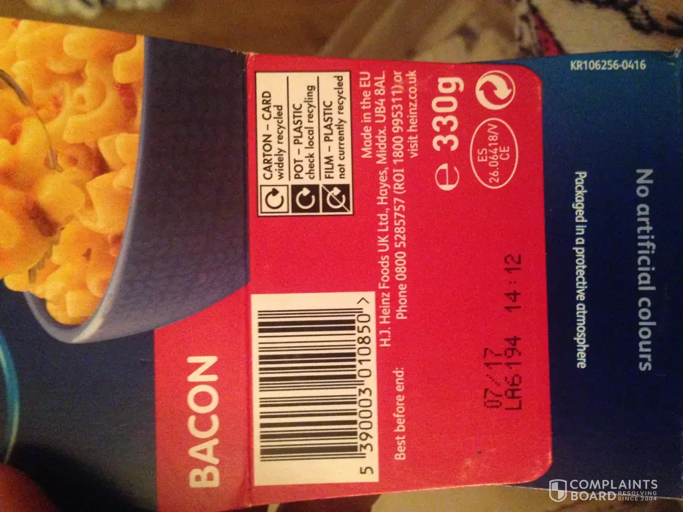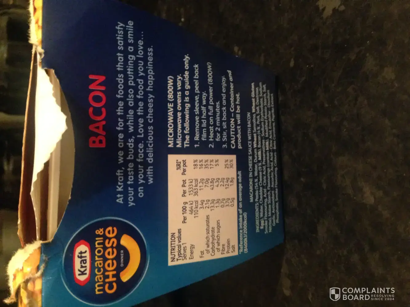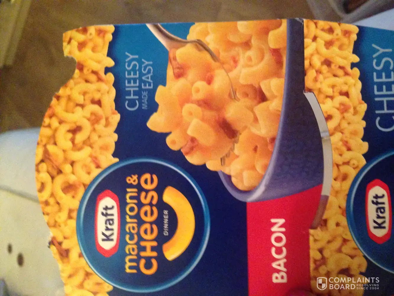 Hi Iam a very frequent user of Kraft products, today I was in total shock when I opened a box of mac n cheese with bacon Micro pack, the smell and look was awful, I have used this product on many many occiaions as my kids n grand son love them, I'm totally disgusted with this, it's all in date and been properly sealed, it has some sort of gel in some parts of the food and of course the smell and colour, Iam willing to send you these photos as prof . This has never looked or smelt like this before, so I know something is very wrong