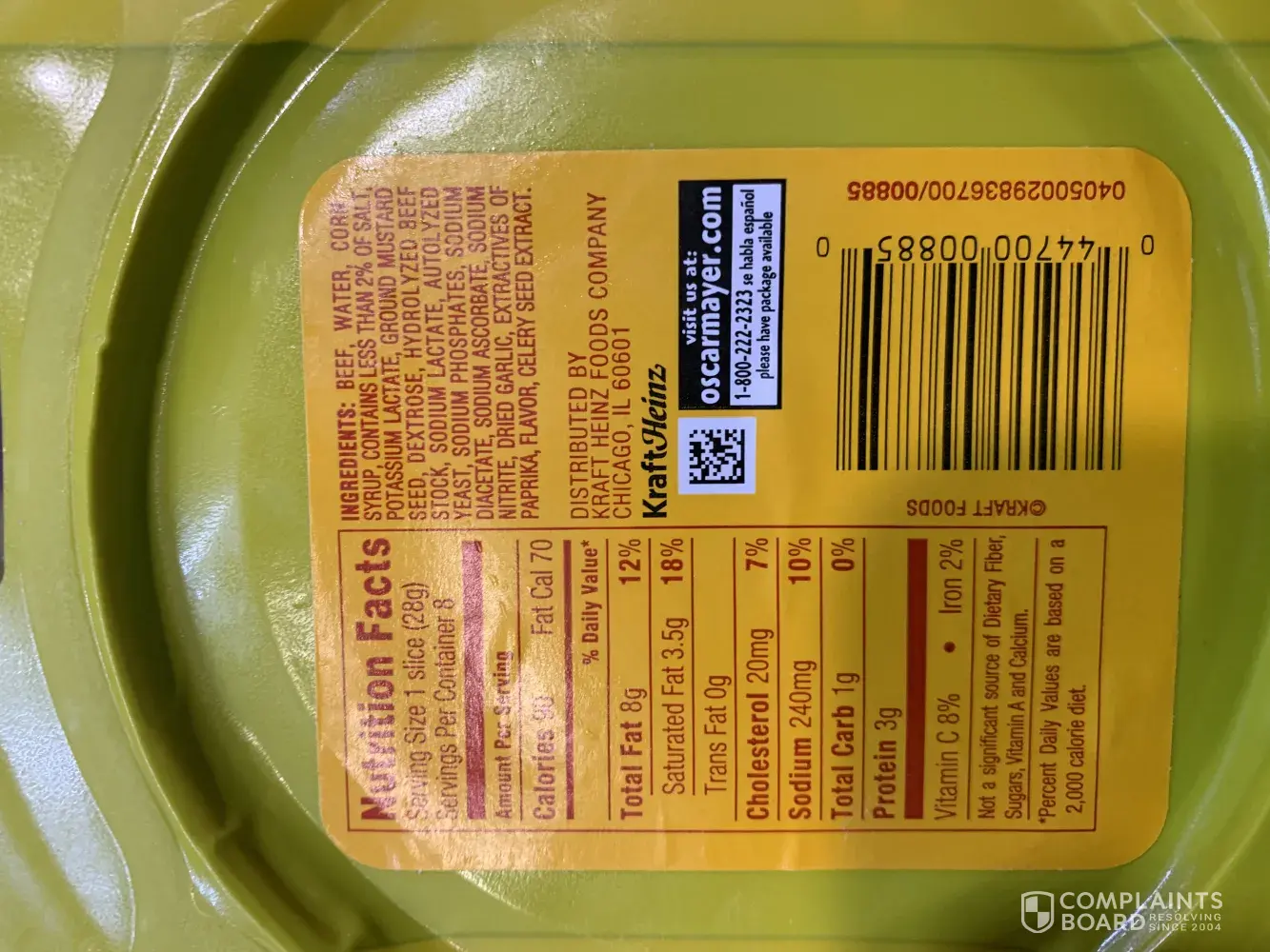I purchased Oscar Mayer fully cooked bacon "Thick Cut". It was suppose to have 9-11 slices but only contained 10 partical pieces'. They were almost impossible to separate as the slices were anything but "Thick Cut". I do not like purchasing a product such as bacon that I can not see. The packaging was difficult to open, first the box, then the resealable porch wasn't so resealable. In the past, Oscar Mayer was a trusted brand...NOT ANYMORE! This is the second package I have been dissatisfied with. I need to contact you now and let you know that I no longer trust your brand and will go elsewhere. I hope you take this opportunity to fix your broken quality control and/or policies. Use by:07 Jan 2015 est 7202 2 14:41
