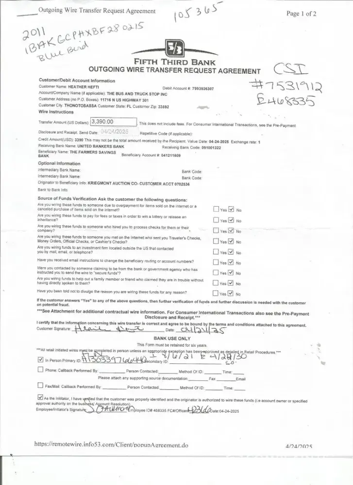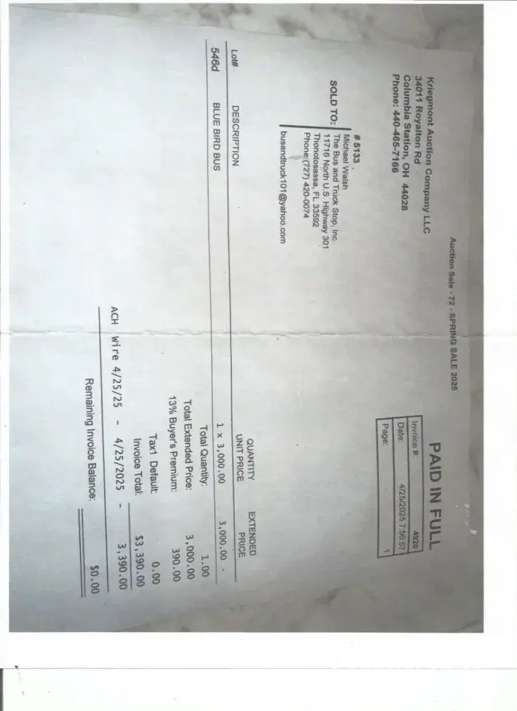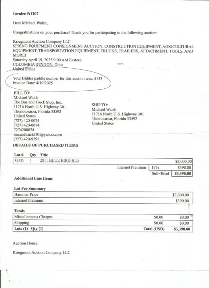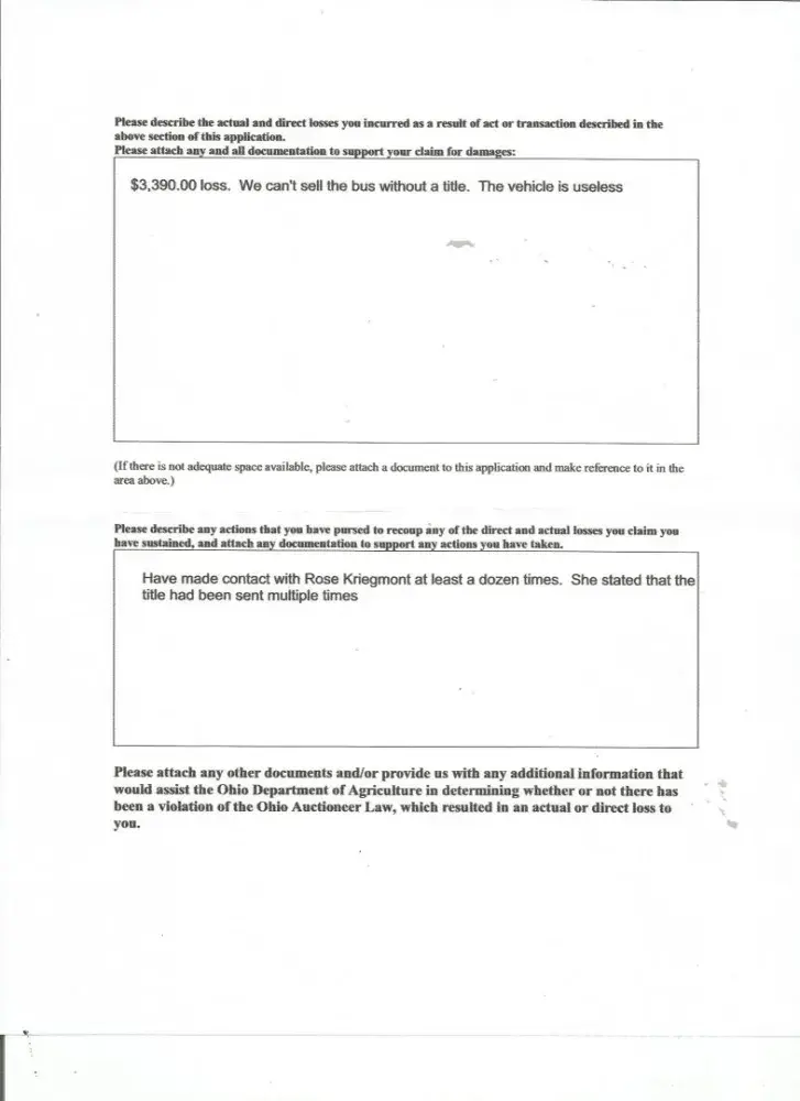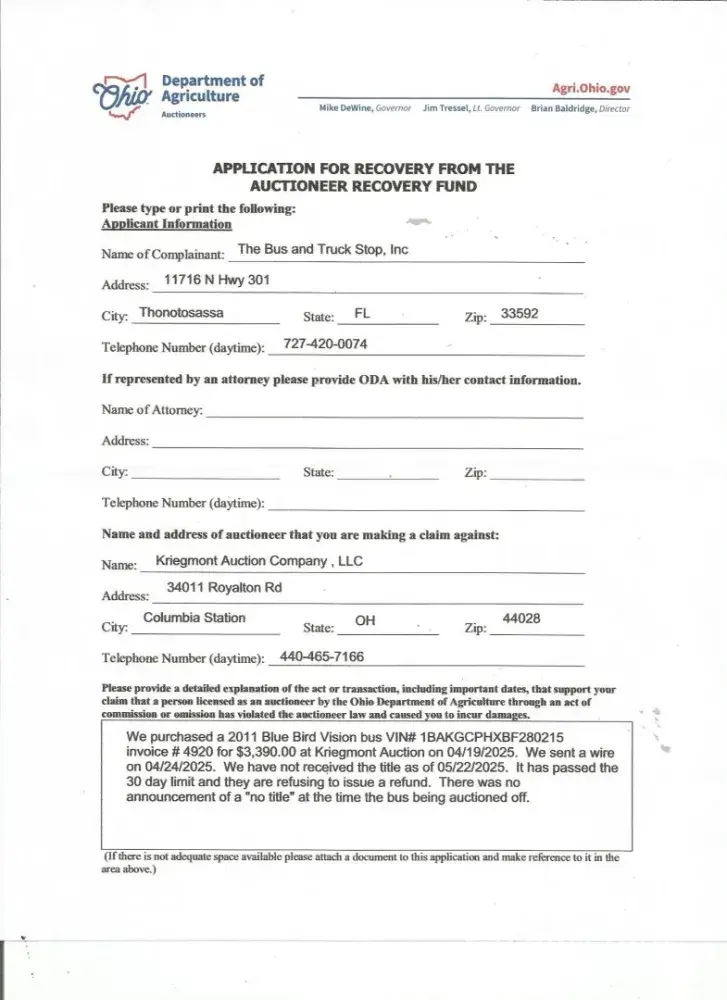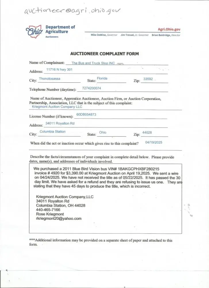 Purchased a vehicle on 04/19/25 at Kriegmont Auction Company Royalton Rd Columbia Station Ohio, never received a title 30 days has past and we requested our money back and they said they dont give refunds and we have 45 days to give you your title which is incorrect according to Ohio Dept of Motor Vehicles its 30. My bidder number was 5133, lot number was 546D Invoice number was 1207 in the amount of $3390 purchaser The Bus and Truck Stop 11716 N Hwy 301 Thonotosassa Fl. 33592 for the purchase of a 2011 Bluebird Vision vin# 1BAKGCPHXBF280215