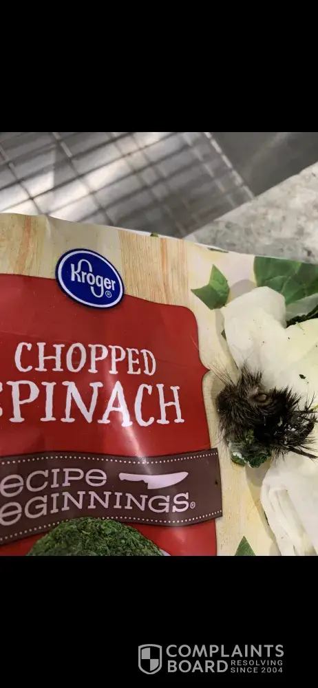 I purchased a bag of frozen spinach and went to prepare it as directed. I noticed something fuzzy and assumed it was mold. When I picked at it, it was a mouse head(whiskers, hair, nose, skull, eyes and all).
