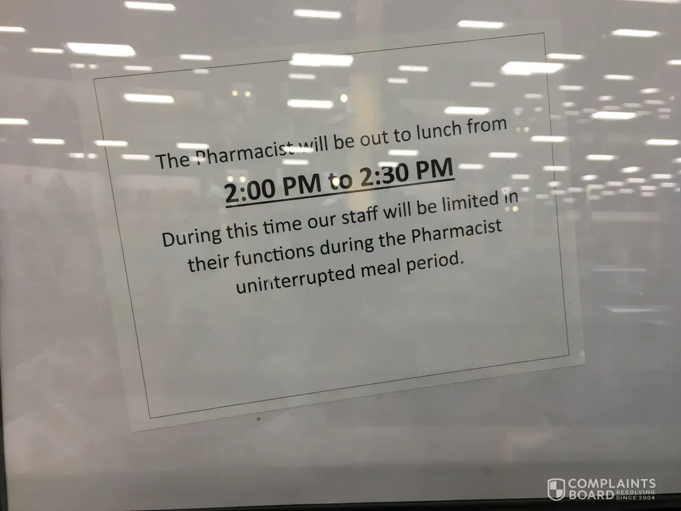 Pick up a script after receiving a text. Rung up by the person tshe said I had to come back as pharmacist was in lunch. Was a sign detailing pharmacy lunch pharmacist did come over and told me she was in lunch she was entitled too but would check me o. I am a senior citizen terrified to come into a store was forced to wait. I am so disappointed I was told...