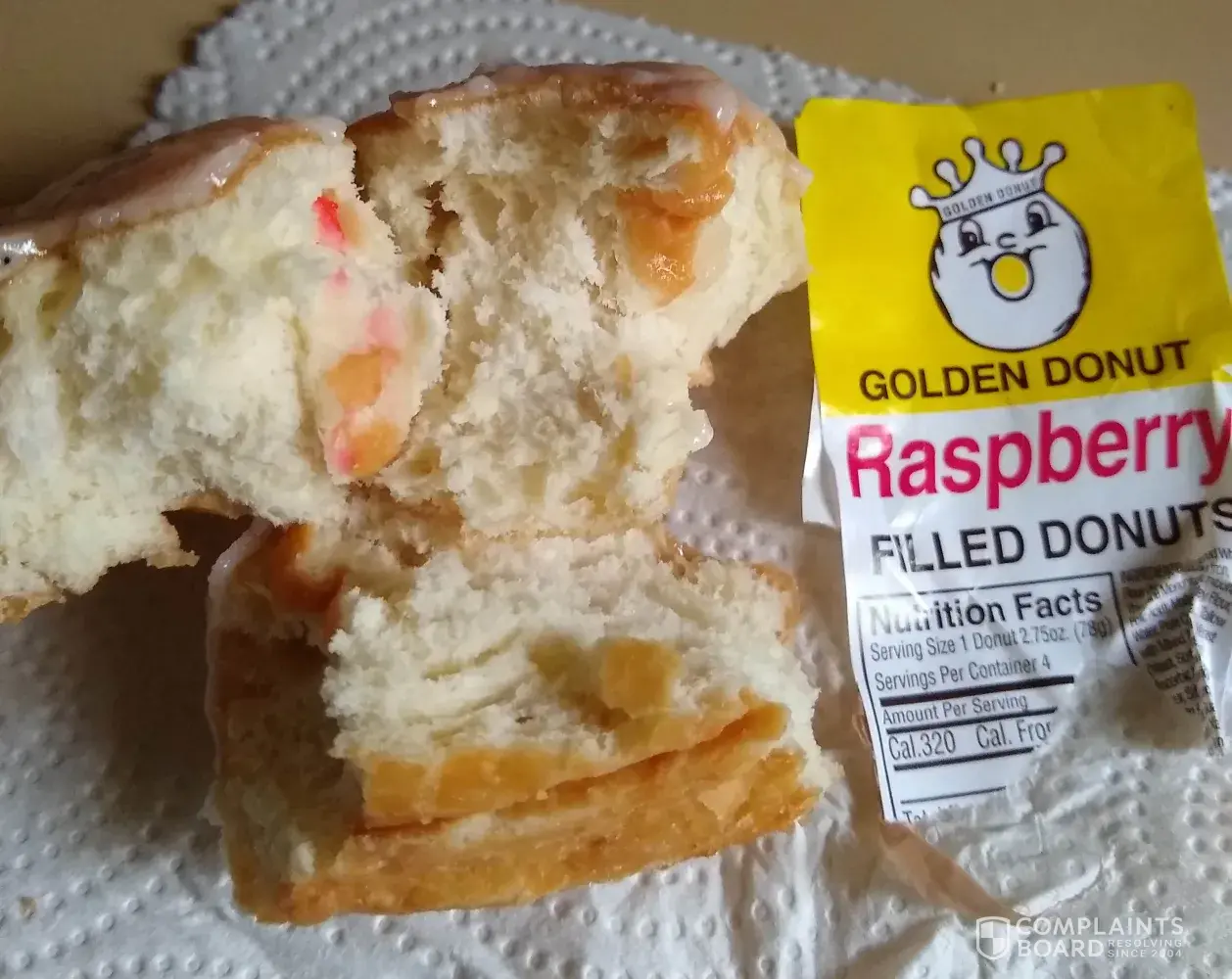 I purchased a four pack of the product Golden Donut. They said Raspberry filled but all four were empty. Only one of them had a small dot of red. I took pictures and showed it to a deli worker. So I have pictures if needed to prove my case. It's a shame that companies sell you products that are far from what they are labeled. I think you need to look into this vendor and consider not using them again. The picture of the product is the only one that had the most filling. Lydia Woomer