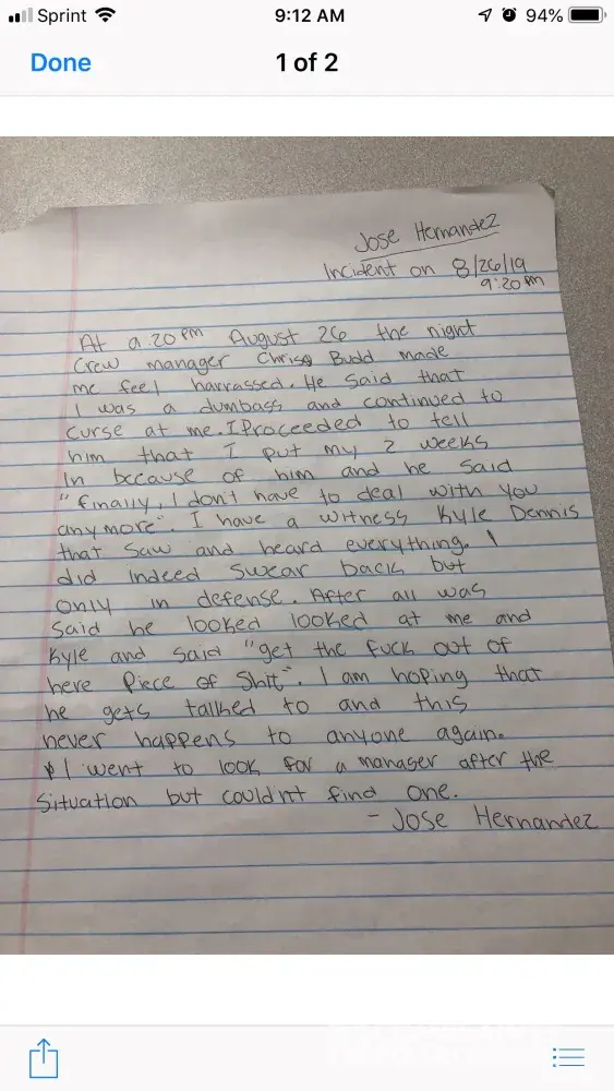 My minor son works for Kroger and recently put in his two weeks notice because of his interactions with the night manager. On August 26, 2019 @ 9:20 P.M. this night manager - Chris Budd harassed my minor son. He was using vulgar language and made him very uncomfortable. I know as a manager he had not right talking to a minor this way let alone another...