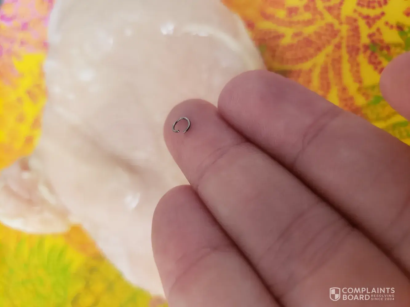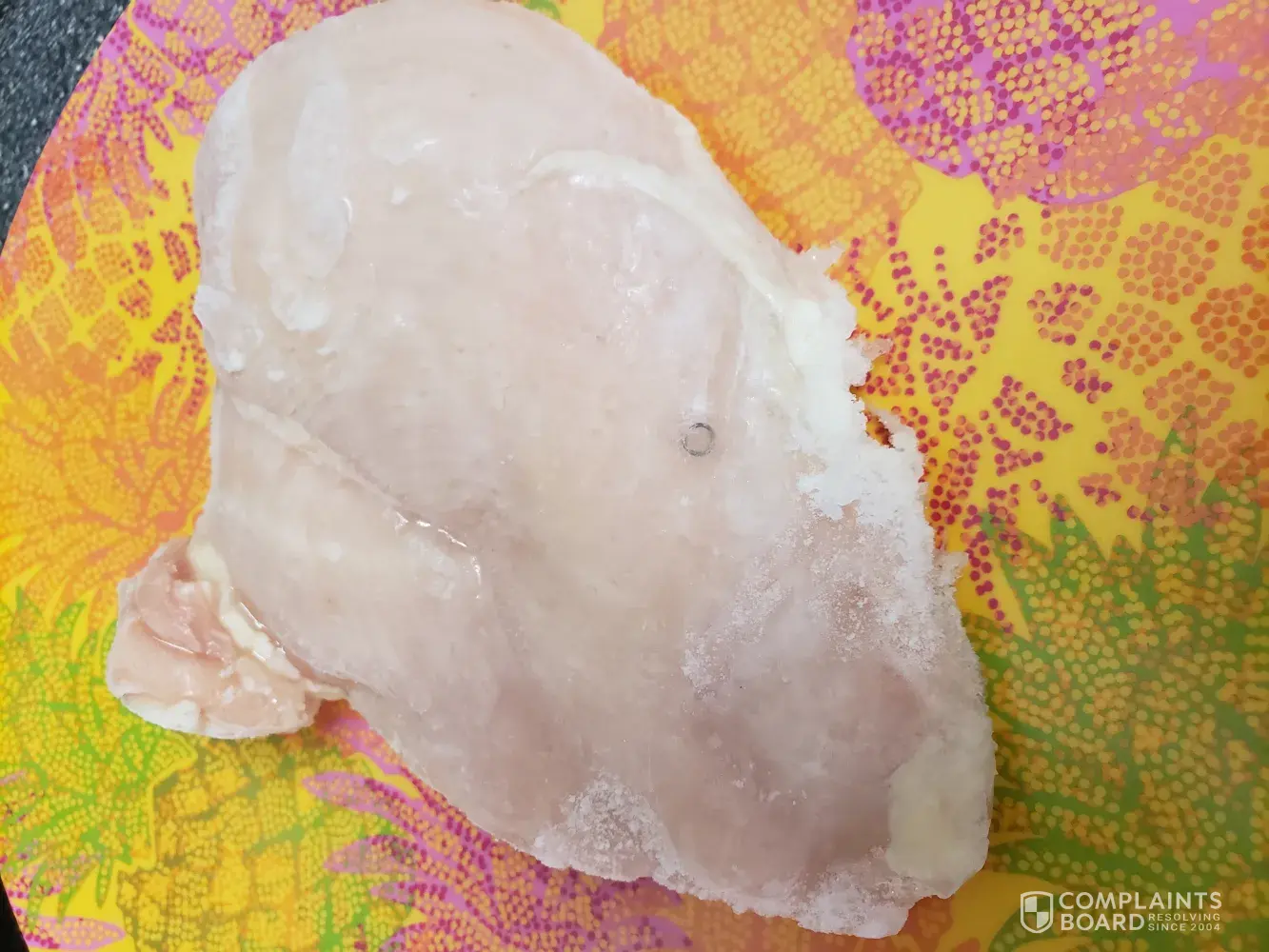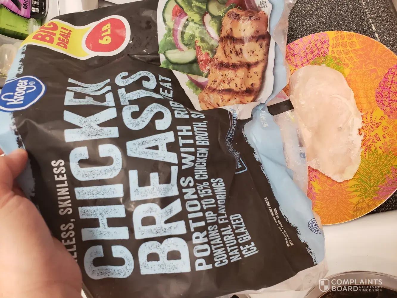 Metal ring frozen to my chicken! I purchased frozen chicken breast about a week ago, and just opened it. I took a frozen chicken breast out of the bag to cook and there was a metal ring frozen to the chicken. I'm lucky I even saw it before I cooked it! I had to let the chicken thaw to get the ring off. I'm so disgusted, I threw the whole bag away. I will never buy kroger frozen chicken again, and maybe not anything frozen by kroger again.
