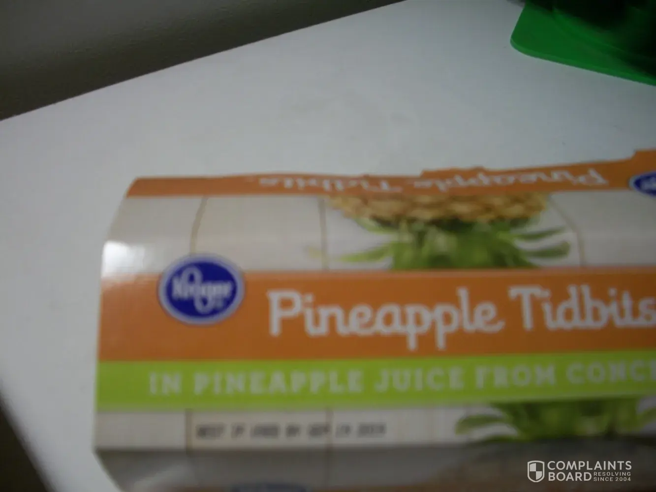 I Beverly Slater have been trying to get this complaint in for almost a year now but I am still trying to get it out there, I purchased on 5/27/2018 package of pineapple tidbits while eating from package saw roach leg in container I contacted Kroger contacts Teresa Dickson, Katherine B. Knox, Shelby Riley, and Rodney McMullen on the issue and no one ha...