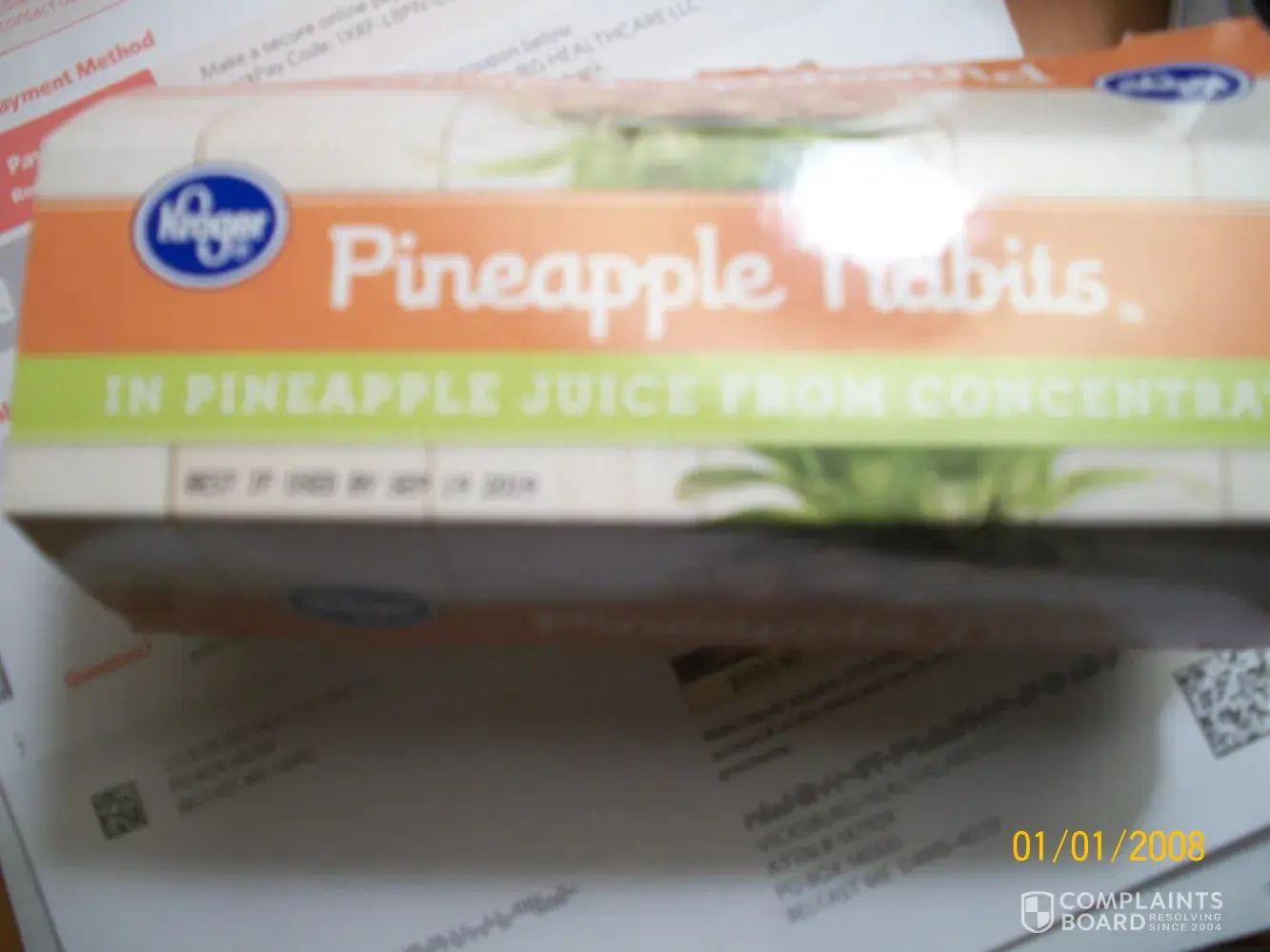 I am really trying to get through with someone employed with Kroger. Again I Beverly Slater purchased a package of pineapple tidbits 5/27/18 and while eating I happen to see a roach leg in container. I have sent a piece of leg because it broke and I still have other part to Pacific Coast Producers to view where Pamela Mee is employed once viewed Pamela Mee informed me to them it look like a stem of product I did inform her at that time it look like a insect leg to me. I still have other part and I think your company need to get someone else to view because I am sueing for $20 Hundred Thousand Dollars for having a bug leg in what I purchased and most likely ate some. I do not want to publicize issue but I will if that is the only way for me to get the issue solved.