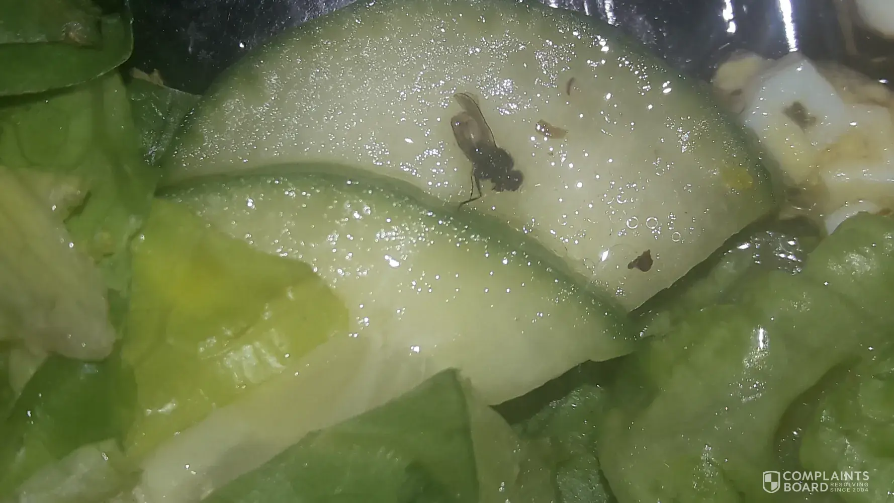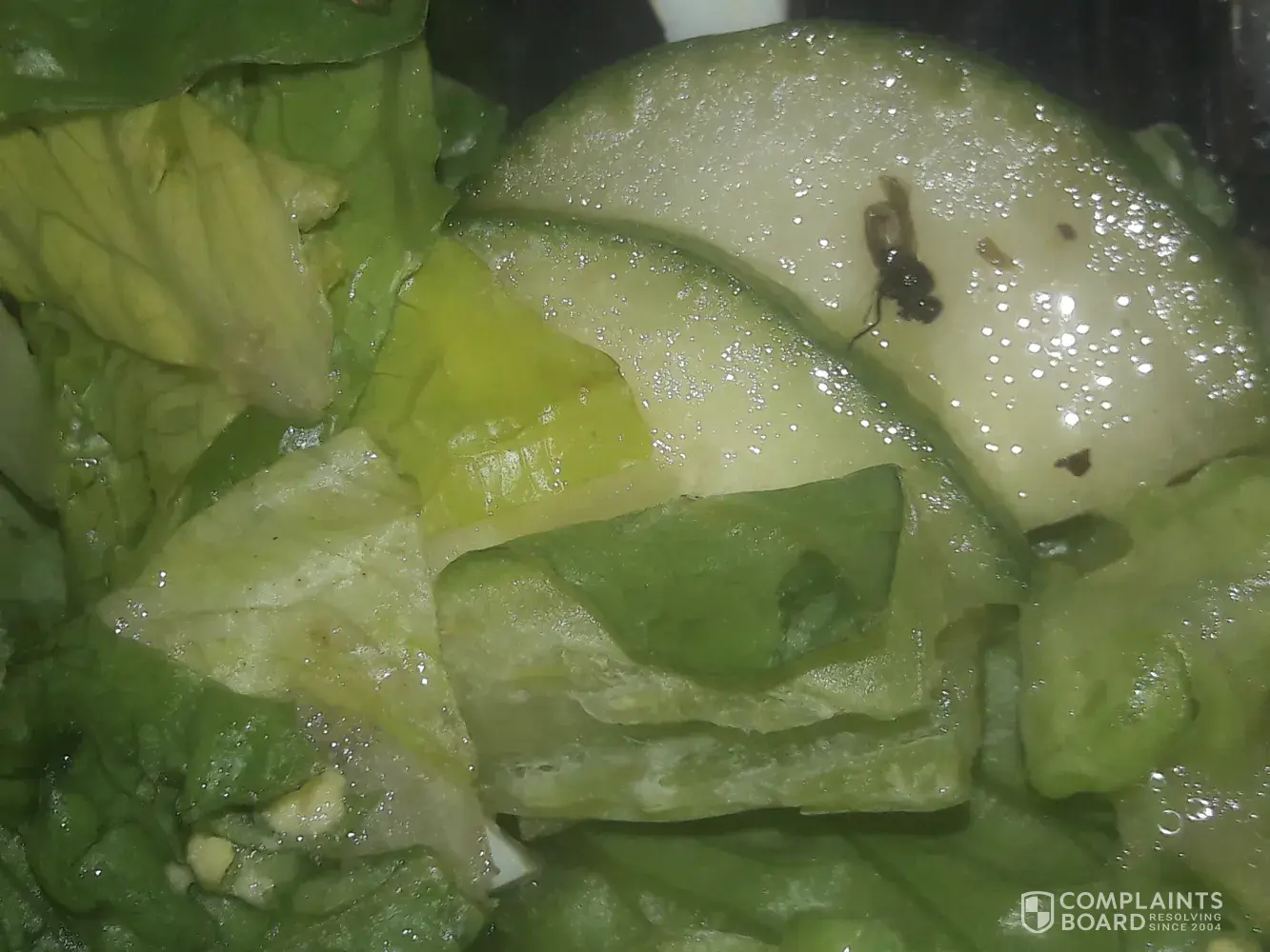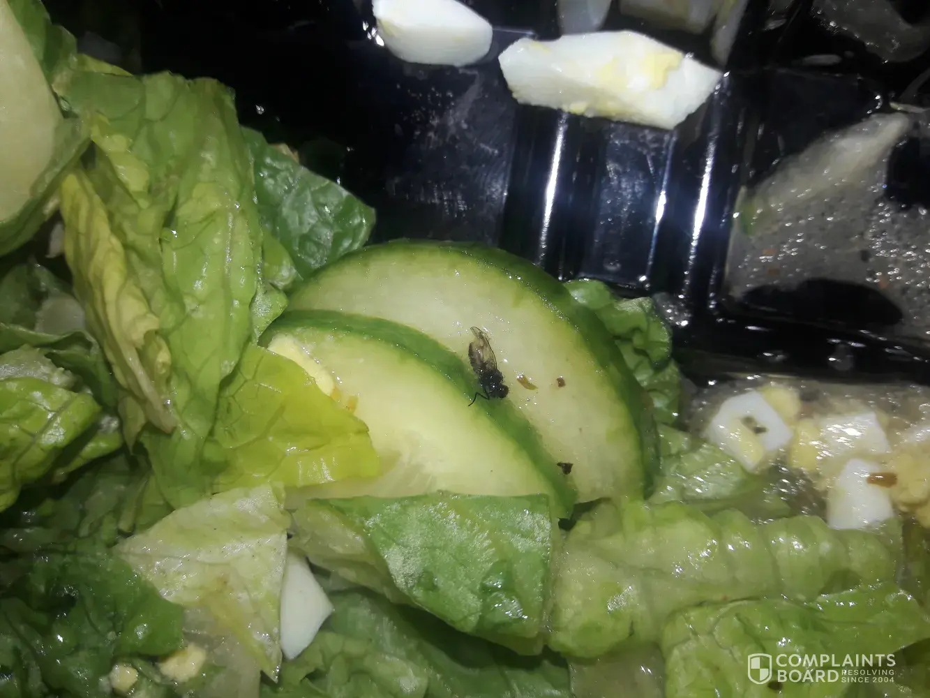 Today, Sunday April 29 at approximately 1345hrs (1:45pm) I purchased a ready made Chef Salad from the Loganville, Georgia store (910 Athens Highway). About 4 bites in consuming the salad I noticed a "baby" insect on the cucumber. As I looked closer I noticed it was a "baby" fly. Immediately disgusted and sickened I no longer ate the salad but covered it and didn't know how to move forward. I'm disgusted not only at the thought that a bug was in my food bit a baby fly. If this is a an infant fly that means maggots had to have morphed in close vacinity or even in the food itself. As a frequent Kroger shopper along with family friends in this area. I normally prepare my salads at home but decided this day to purchase one from this store. I can not fathom the thought as a person in hospitality for my client to experience a nasty vile insect in their food. Thinking of the life cycle of a fly is unbearable and to think I may already consumed another or a maggot have laid in some part of this salad. I will promise you (upper mgt) I will NEVER stop at Kroger again. You have lost a valued customer. If it's not caught in the process of prepackaged lettuce/salad then I could imagine what the meat or store brand veggies are packaged. Please contact me so we can remedy this concern as soon as possible.