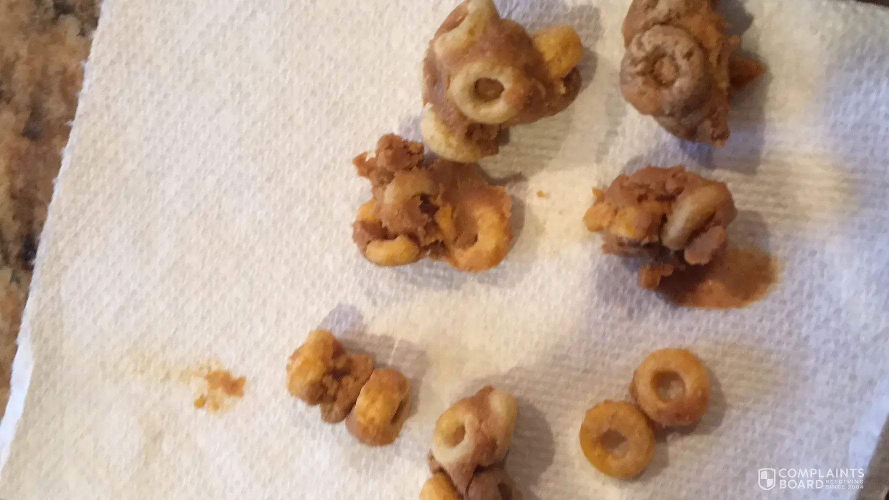I purchased a box of cereal last week and was about 1/2 way through it when today I was pouring into my bowl and a big glob of cereal and peanut butter flies out. I wasn't to thrilled about a wet good being in my cereal. It smells funky and looks like the peanut butter is bad, if that's even possible. This is the first time I've tried Kroger brand cereal and it was good until this point. I'm grossed out a bit.
