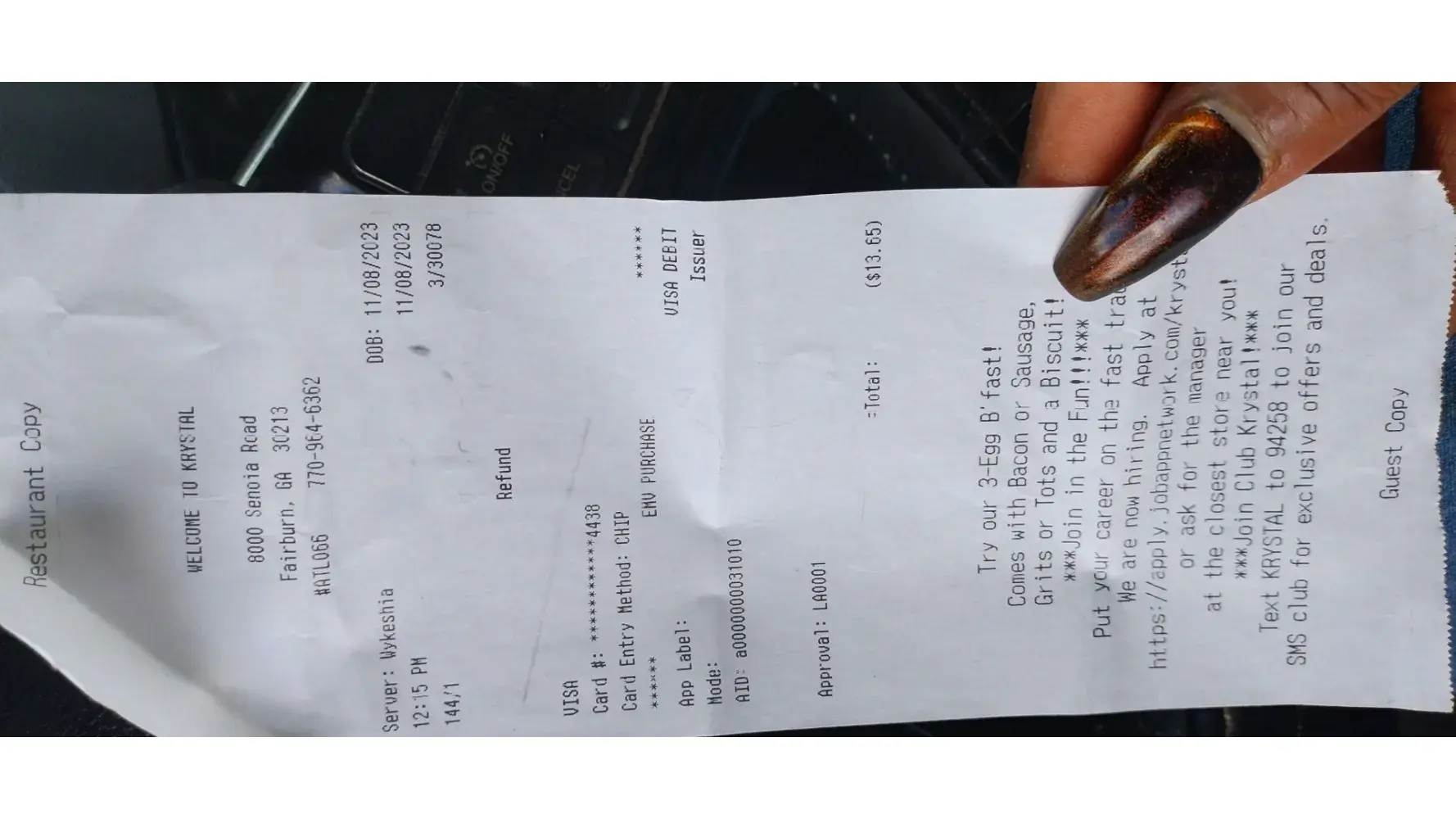 Sunday morning November the 5th at 4:00 a.m. almost breakfast time I went to Crystal's to get some food and wind up having to get their regular menu instead of the breakfast menu anyways I ordered a number five I think comes with the cheese crystals and chili cheese fries well the chili cheese fries were not even on my order they left them out I got four cheese crystals that were horrible they were the worst meat I've ever eaten at a fast food restaurant they were like salt pork hamburgers I mean it was atrocious and the bad thing about it is I went back to get the problem resolved talk to the manager in an employee although they handled it well and it looks as it was going to be taken care of they instructed me that they didn't have the authority as the other manager and I would have to come back and see her early in the morning that she's the only one that can give me a refund so they kept my receipt there at the cash register and told me it would be there when I came to see the other manager in the morning which is a girl named nakia I went back to see that manager and it was a horrible experience she was the only one at the store this was the November 6th at about 7:30 in the morning first off she didn't really care about taking care of my complaints nor did she even act like didn't pertain to her anyway whatsoever I was basically bothering her you know in her time you know I don't understand how she can feel like that she is the manager at the store she is the person that supposed to take care of the customer service issues but I guess she didn't get that in the employee handbook anyways not the fact that she was just rude she was just flat out a horrible person because all she did was look at me and weird ways I guess because I was in sweatpants and I'd walked to the window like I was so homeless refugee and she didn't have time to concern for me but anyways I told him my situation she instructed me that she couldn't do anything about her seat well I just heard the receipt was left there at the register and I was just here you know 8 9 10 hours ago something like that and told her everything that happened and she said she couldn't find me a seat told me couldn't do anything slam the window in my face and laughed at me so finally I got to open the window back up and I asked her if I can get her name and the number if she could touch with the corporate she told me that if I want to get in touch with cork it I can corporate I could talk to hey Google maybe I could find somebody that can help me there anyways that's my experience and I will say it was the most horrible customer experience issue I've ever had with a company or corporation I never thought somebody could be so rude and make somebody feel so disgusted when all they want is their refund for the horrible meal they received and are didn't receive half of it wasn't even there thank you I hope this is resolved then have a good day