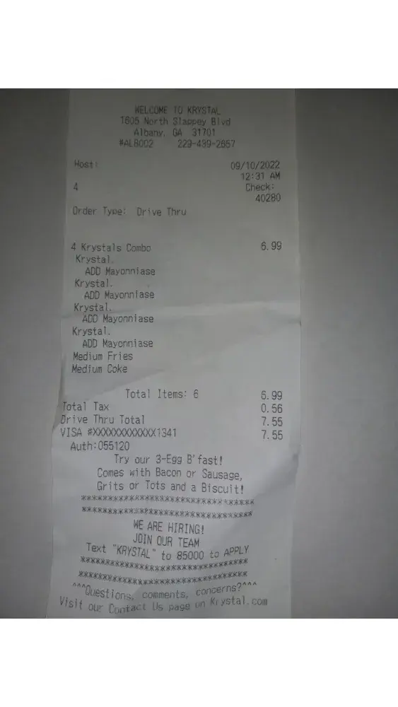 Krystal on 6605 Hwy 85 /date [protected] at 1:56 am check # 30247. /The food was not cooked properly and when I seem that I was very disappointed. A 24 pack of Krystal my friend had drop me off at home. The line was long that gives them no reason to rush the cooking time.